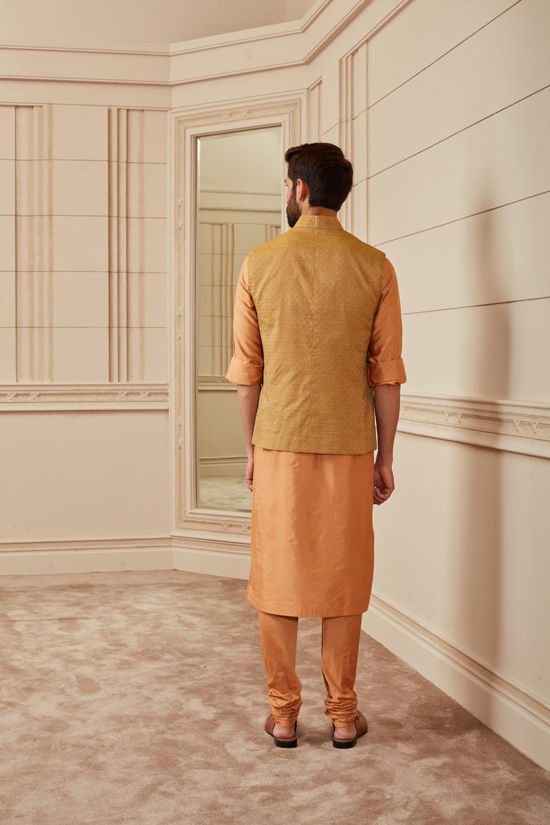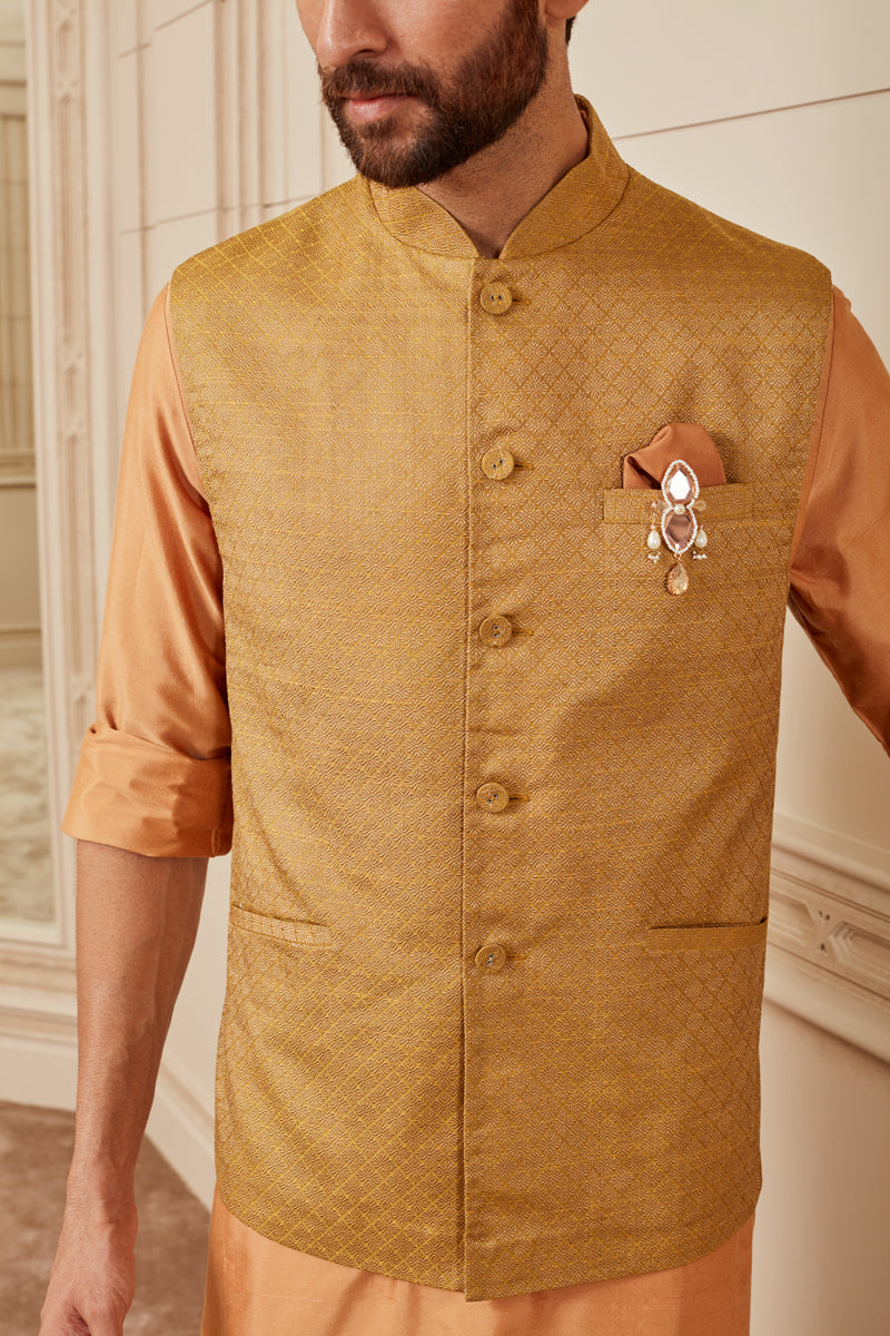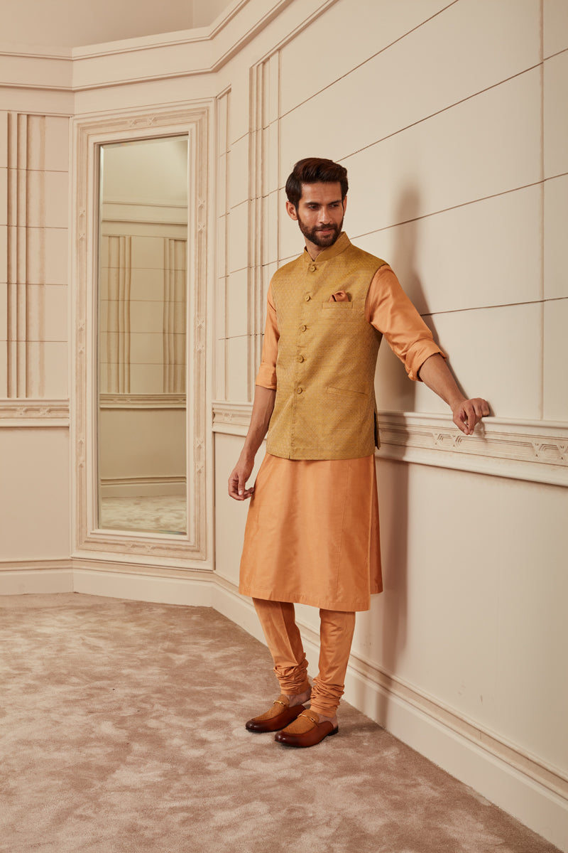 Go all out with colour at your next haldi event in this mustard bundi in a poly-cotton blend fabric. It has detailing on the collar and buttons and can be paired with a contrasting peach-shaded kurta and churidar set. The look is finished with a pair of two-toned tan loafers that can be easily slipped into. This is an unusual colour combination that is sure to get you a few compliments.