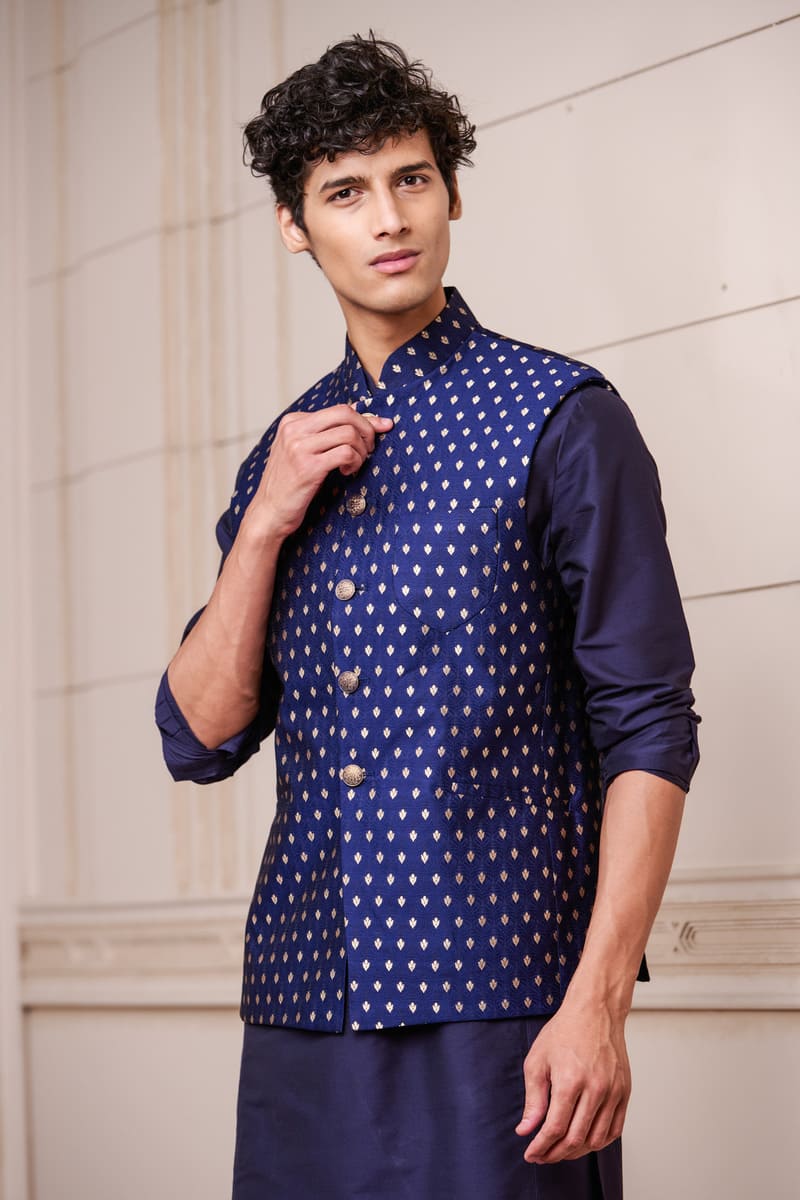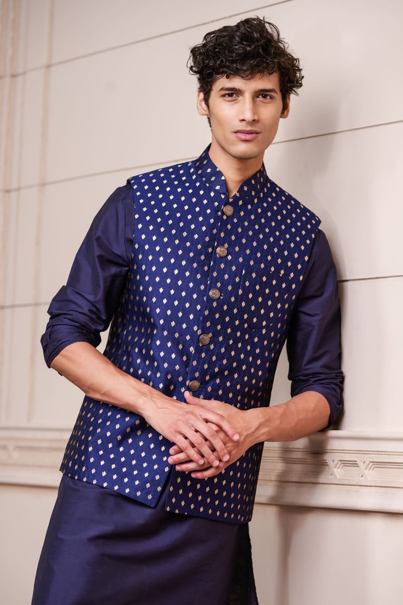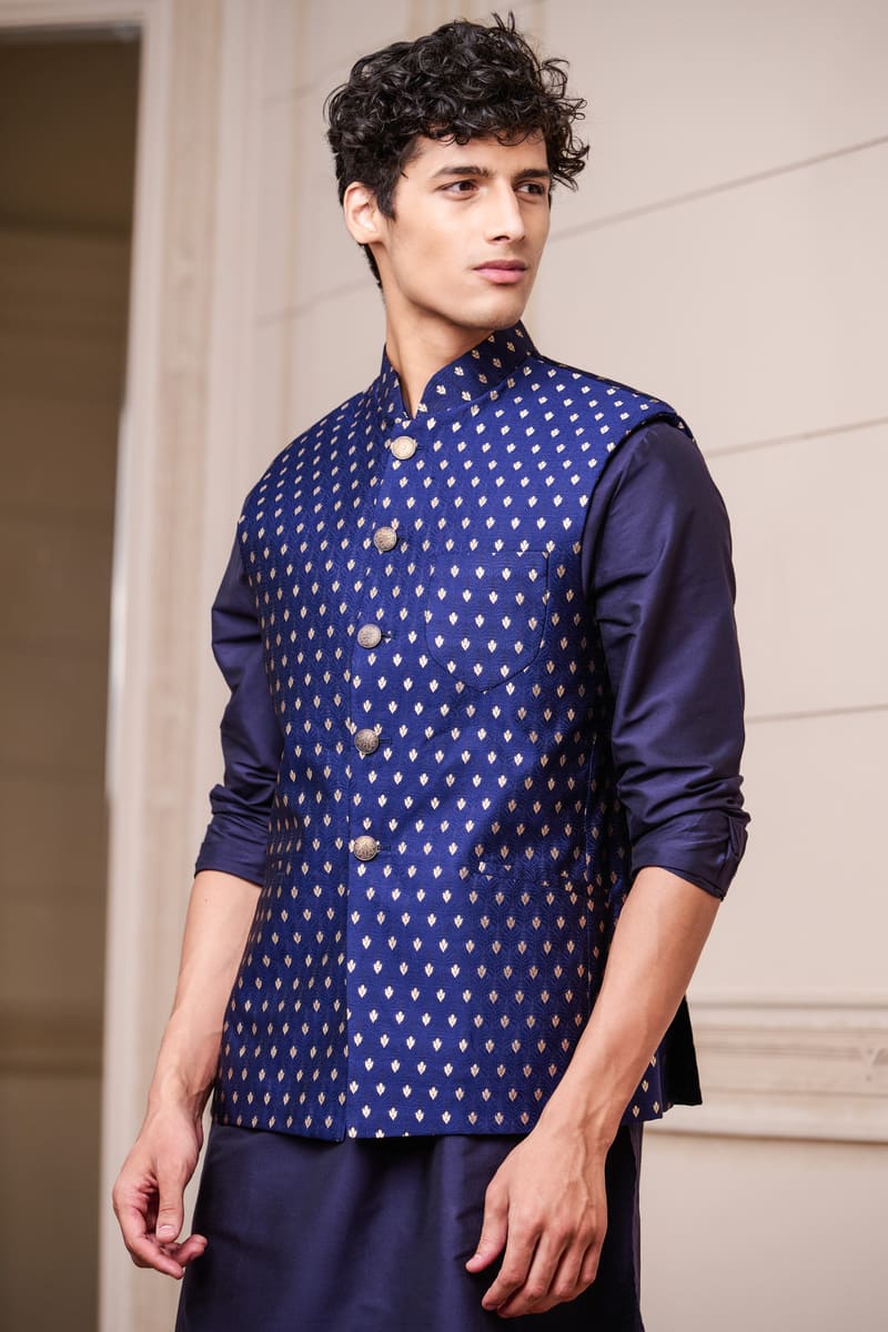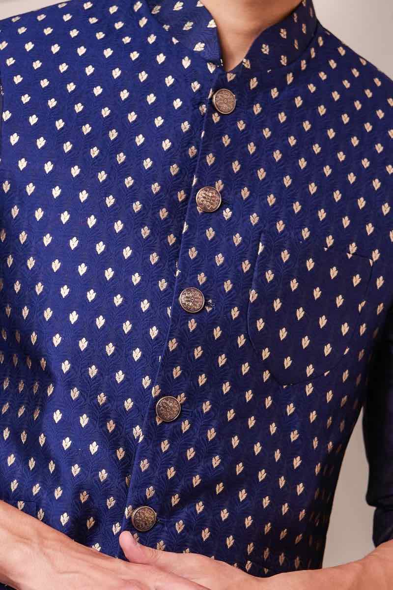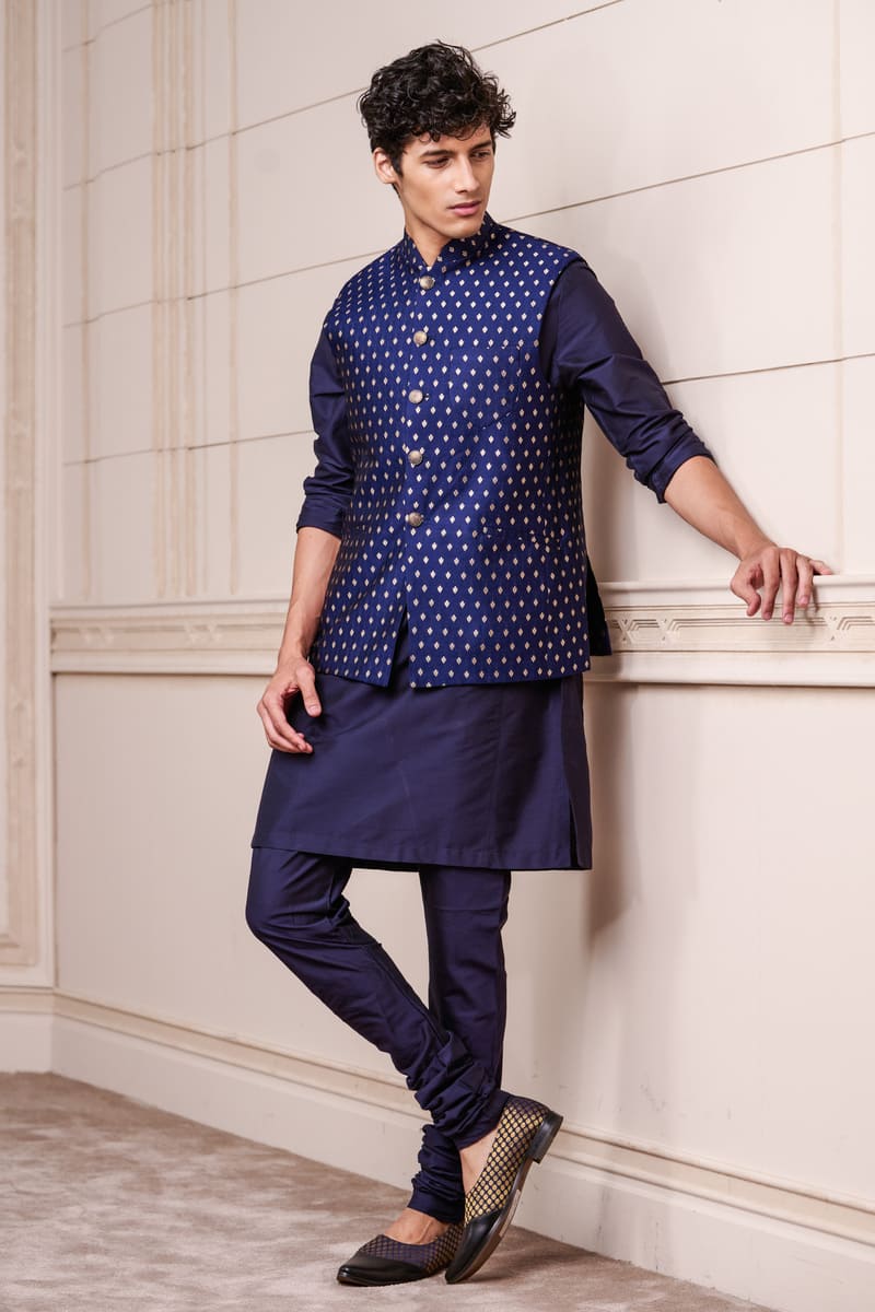 A kurta bundi set, in navy with matching kurta and churidar pants. The jacket is made with zari brocade and has topstitching on the collar and metal buttons. A great choice for groomsmens' outfits.