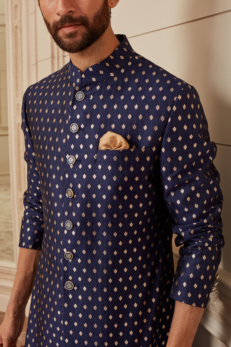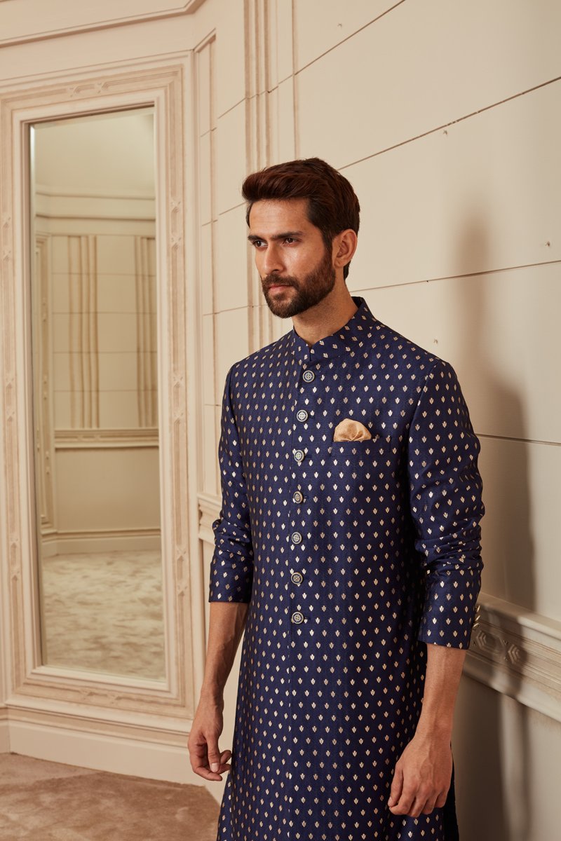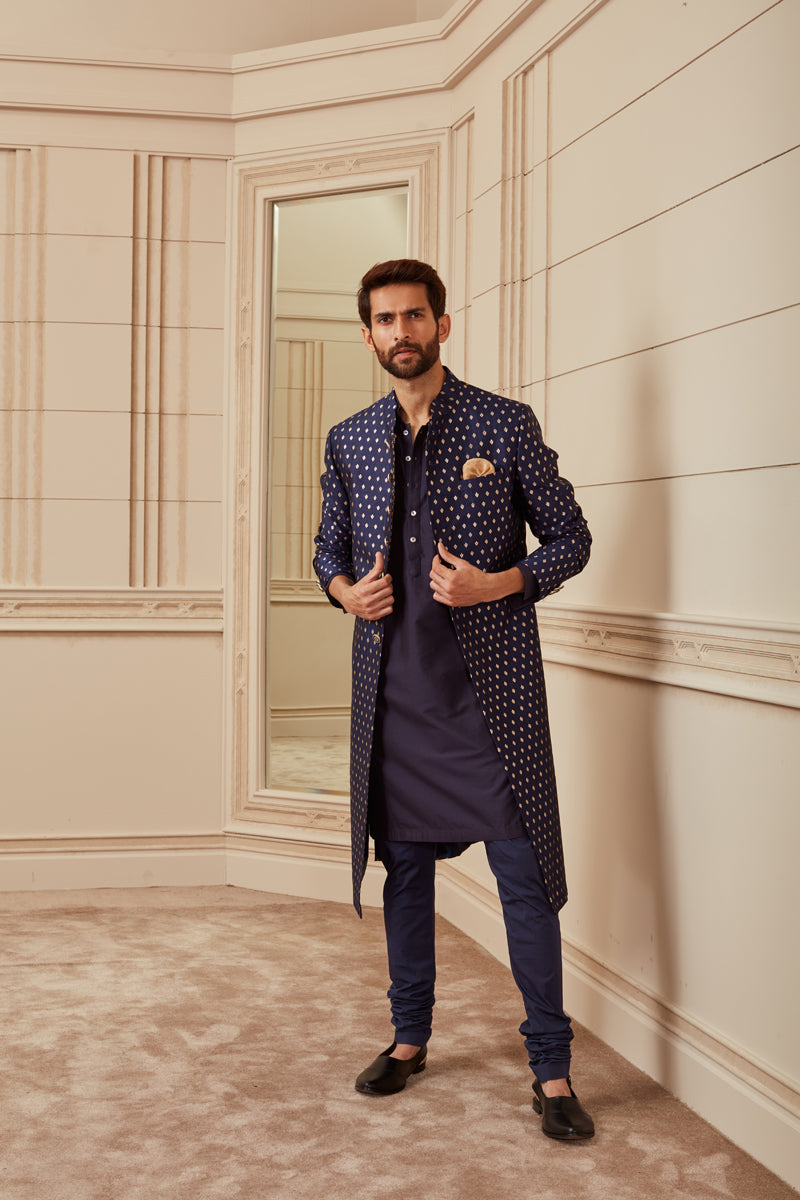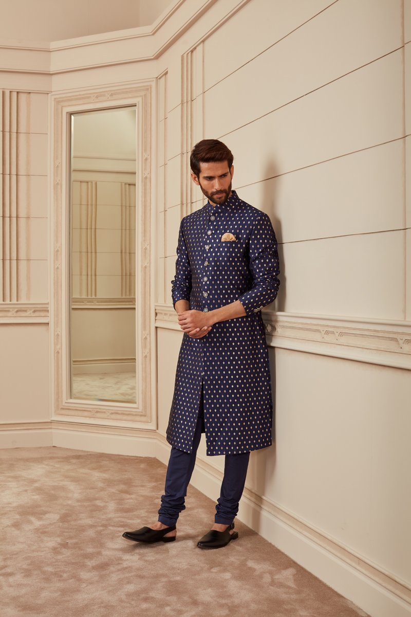 Get surrounded by an air of sensuality when you wear this dark navy blue sherwani to a wedding. Designed in a tanchoi brocade fabric, the piece is decorated with silver metallic buttons that match the all-over texture on it. Pair it with a pair of navy churidar pants and sleek black leather sandals. Break the monotones with a delicate pocket square in beige.