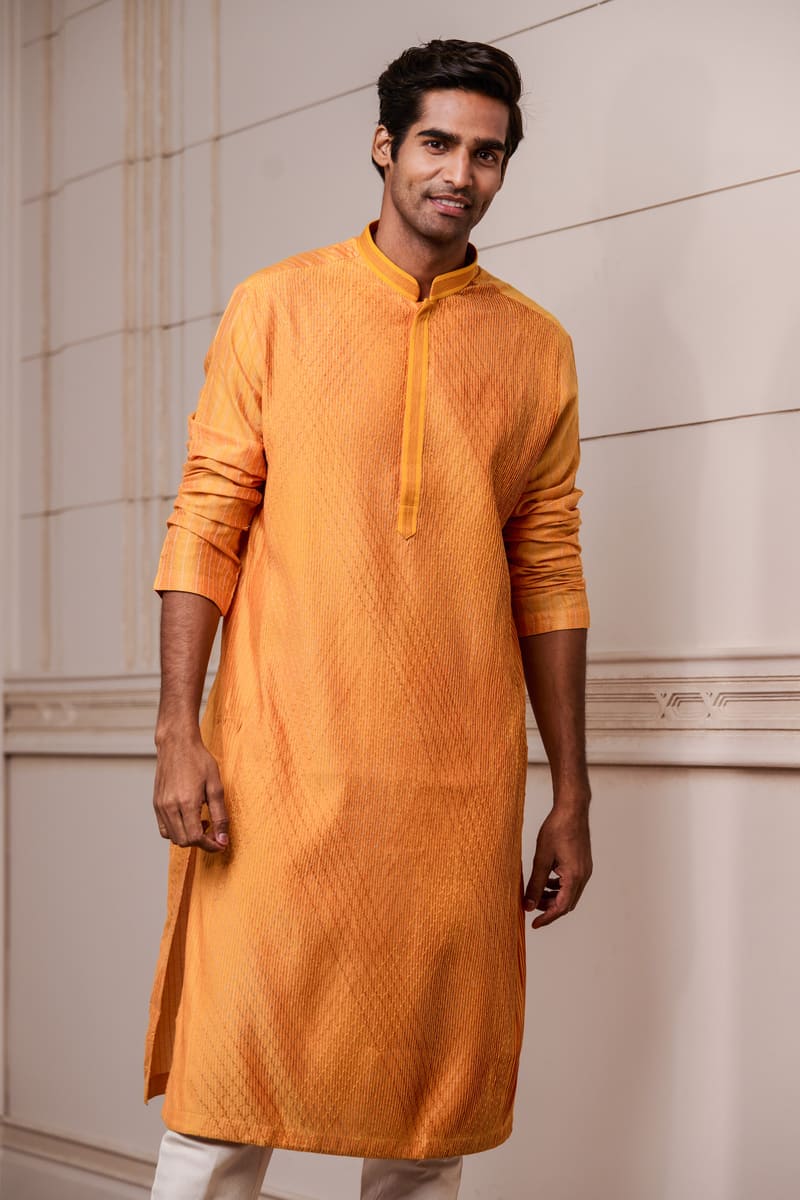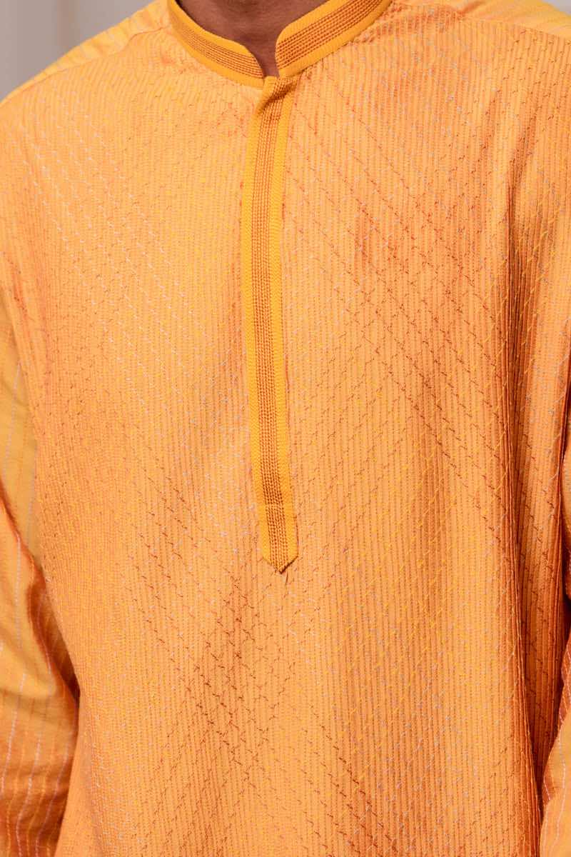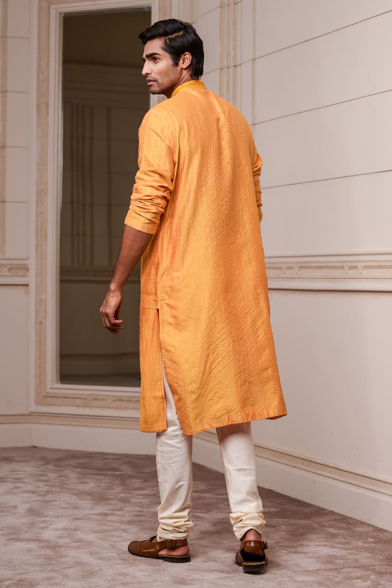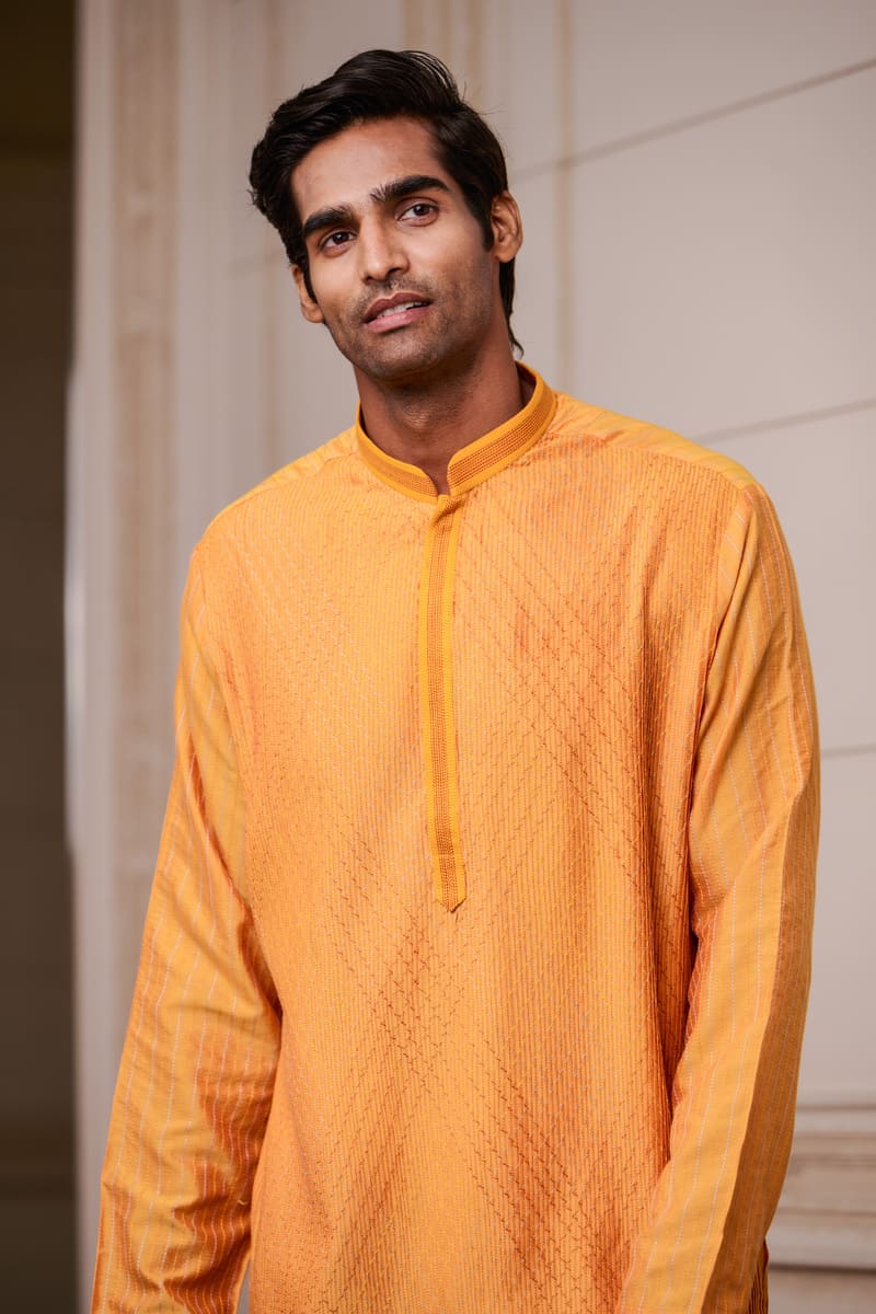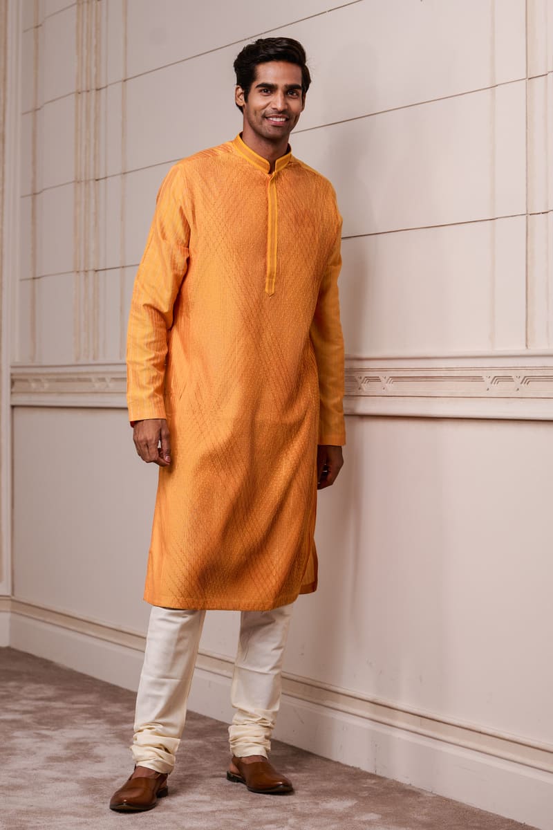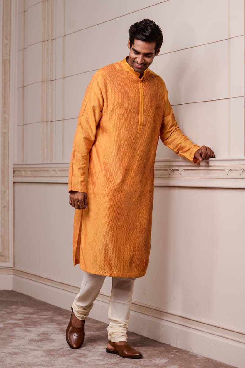 A kurta set in a regular fit, with a coordinated ivory churidar. In a bright, sunny shade; the kurta is in a textured fabric and with a beautifully detailed placket and band collar . A bold choice for the fashionably fearless.
