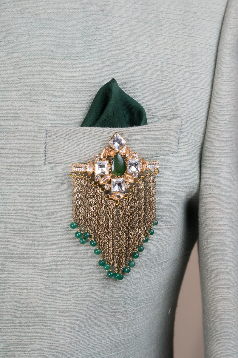 Your wedding outfit is only complete when accessorised with an ornate brooch like this emerald brooch that is encrusted with crystals and features metal chain drops.