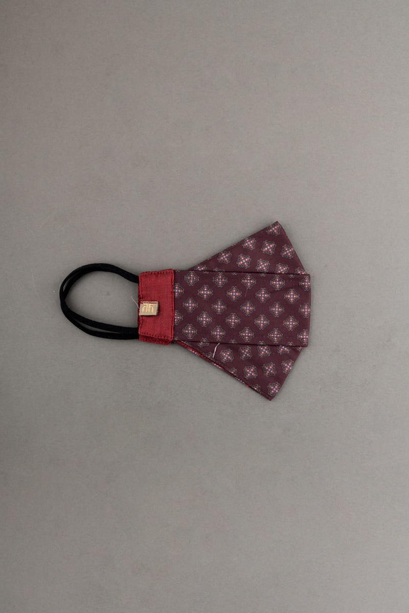 Give your festive outfit a lift by wearing this maroon and red printed mask that features white stitching.