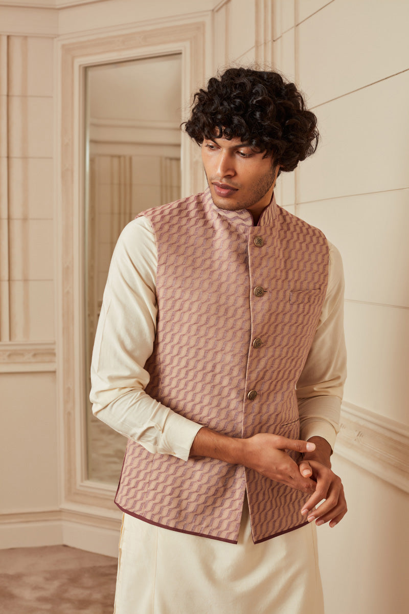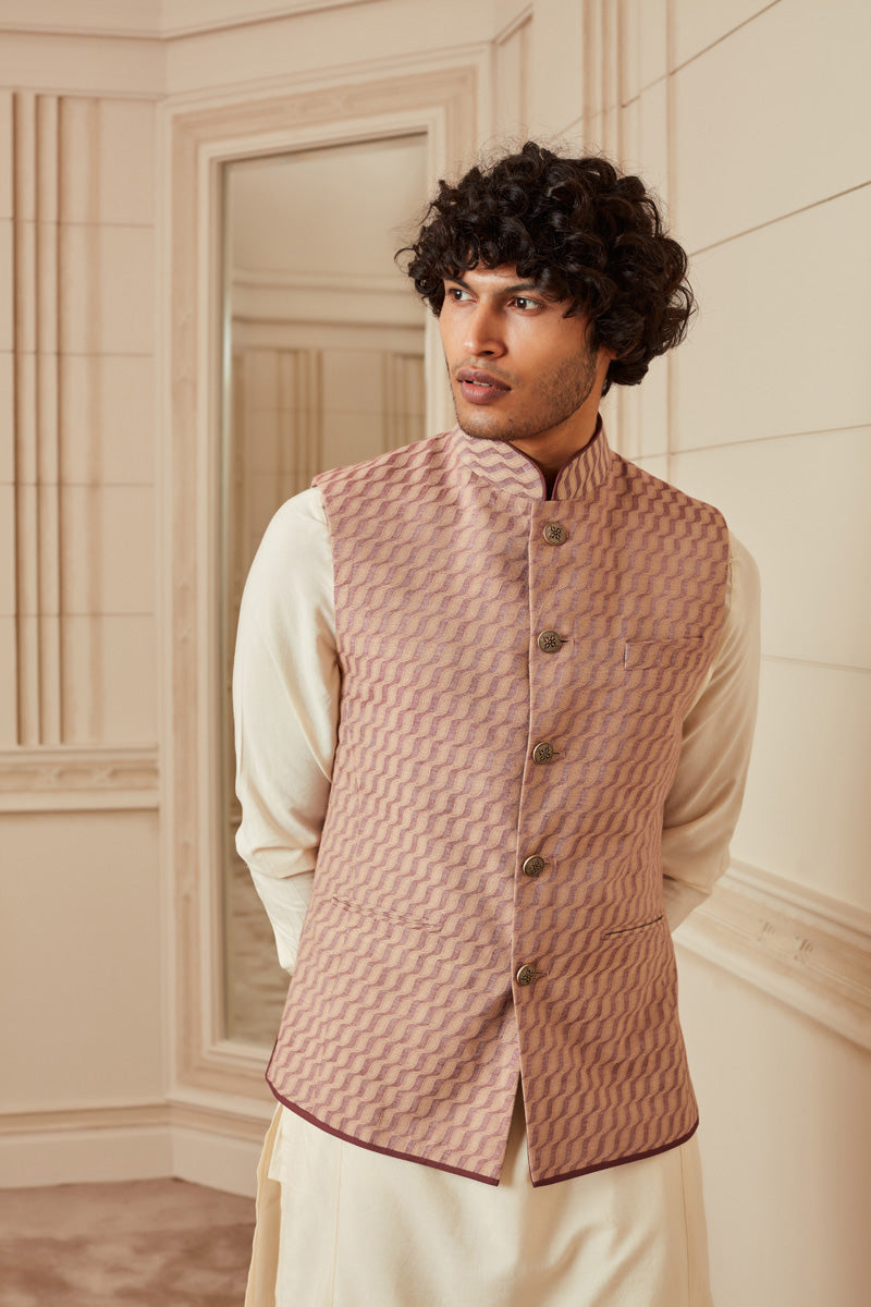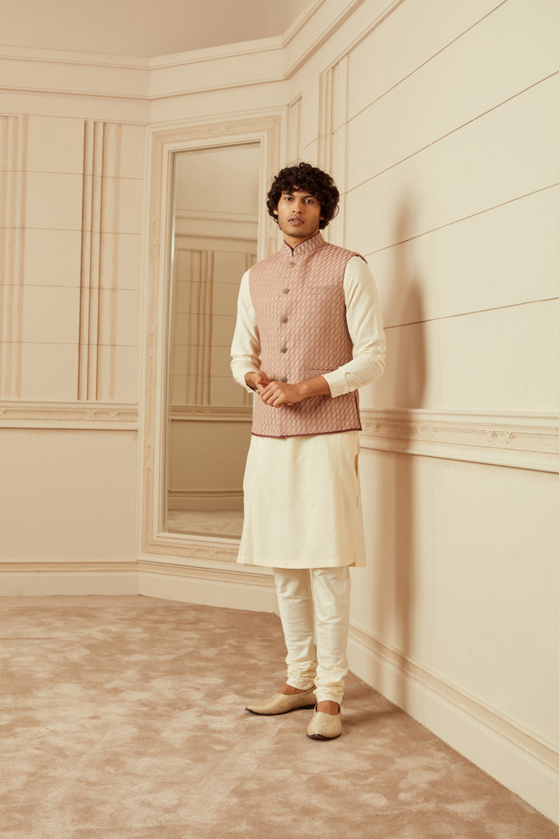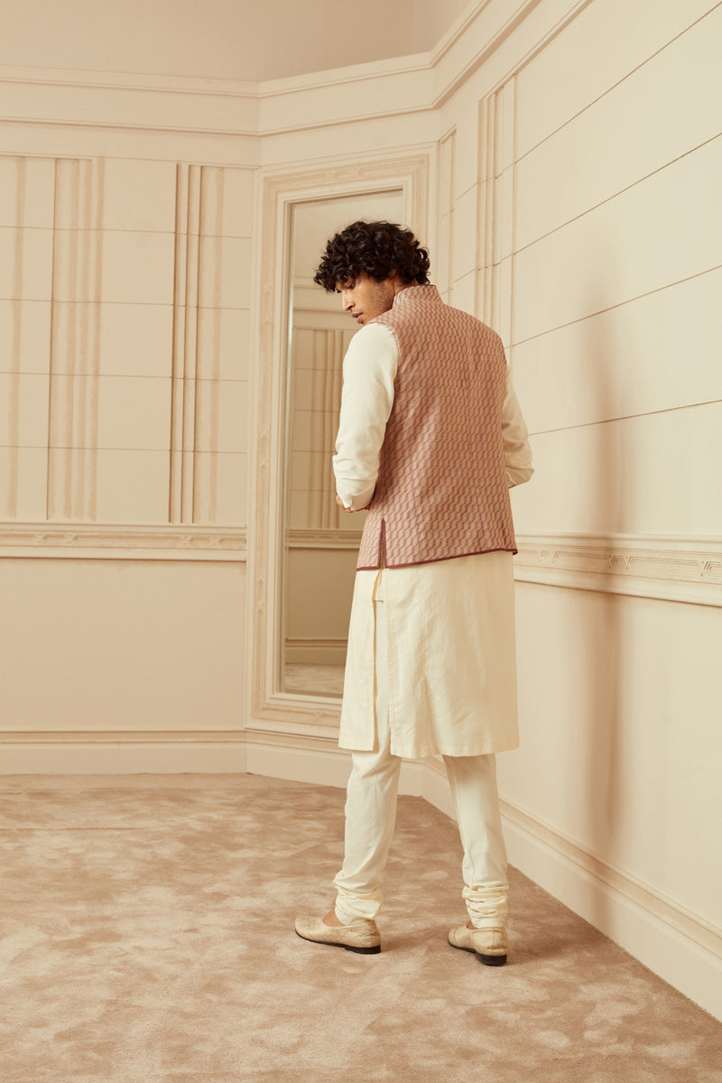 If you’re wanting to experiment with a shade of pink, but need a bit of guidance, then look no further than this purple jacquard bundi. It is also decorated with metallic buttons. Complement the jacket with an ivory kurta and churidar set. A pair of easy footwear that will keep you going all day long is a definite yes!