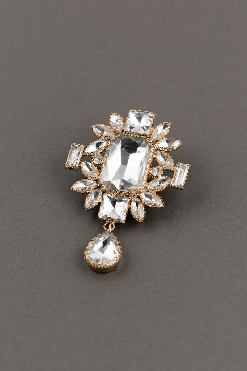 With an understated outfit that needs a bit of punch, wear this all-over crystal-encrusted brooch with drop detailing.