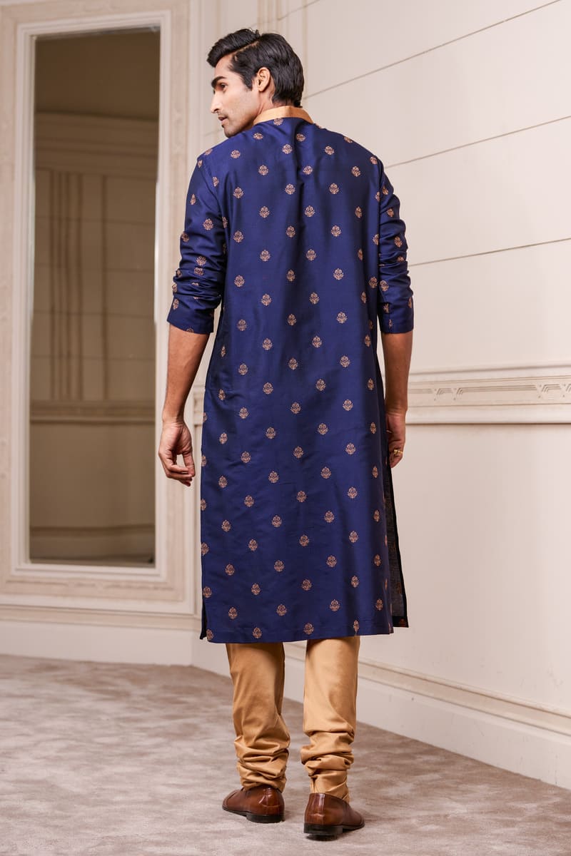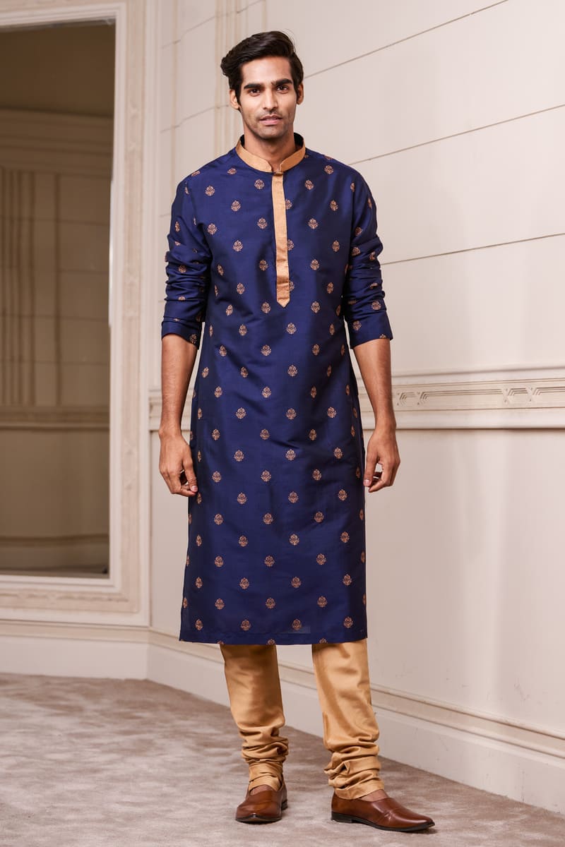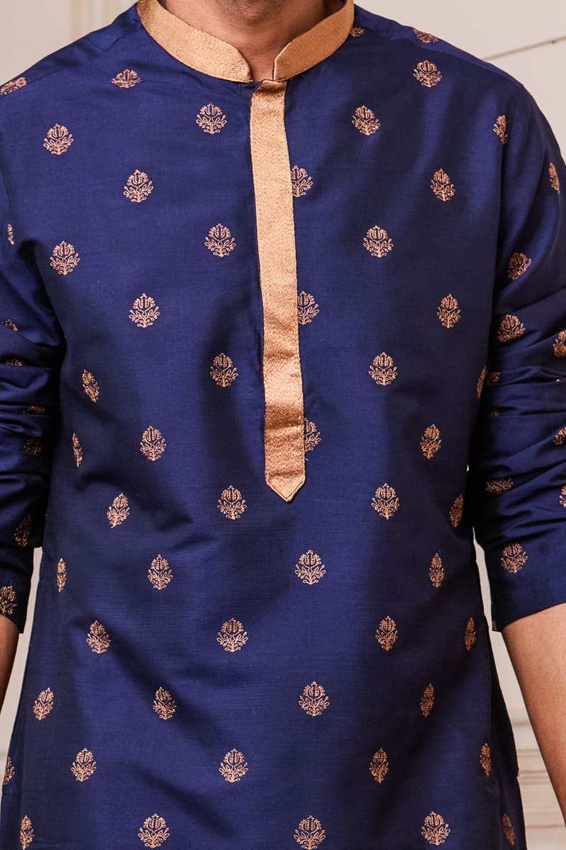 This Navy kurta set with a coordinated churidar, is a great choice for a day event. This style has delicate butti thread embroidery on the fabric and a contrasting gold band collar. Wear with brocade mojaris for a traditional look.