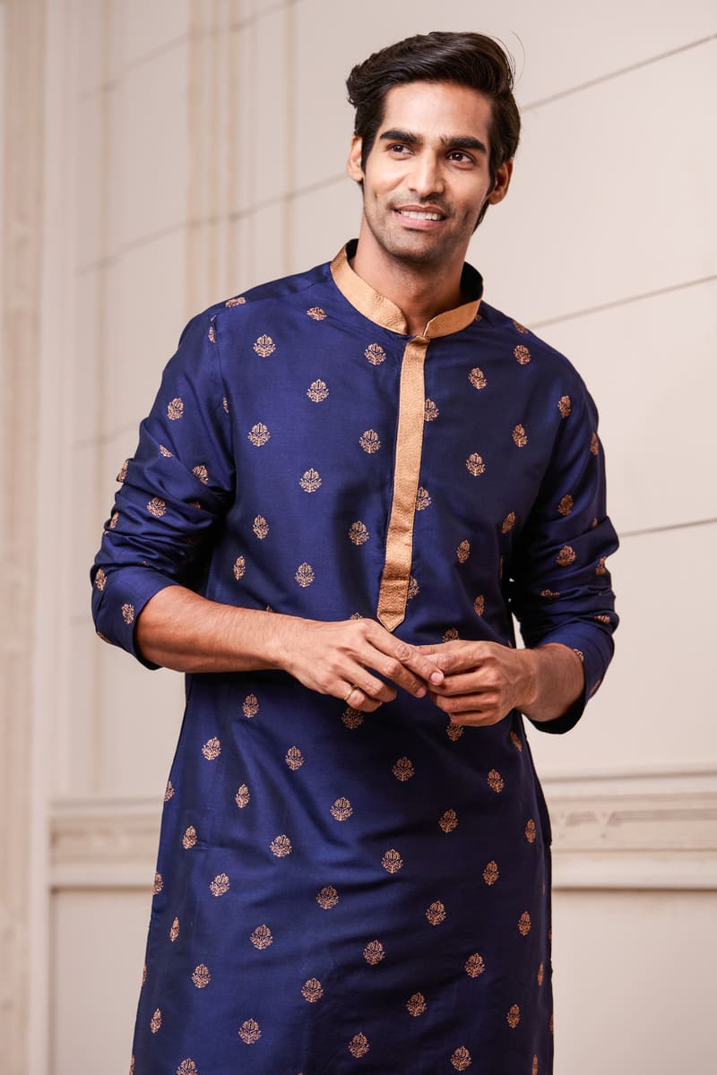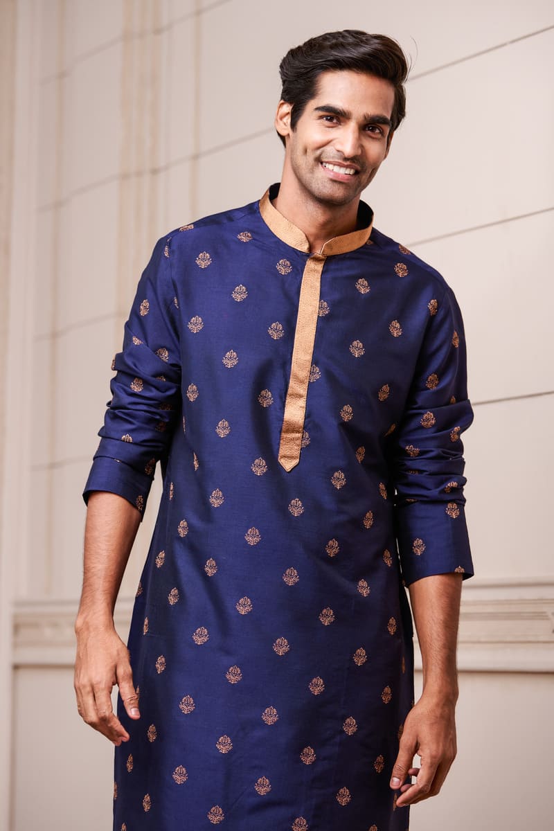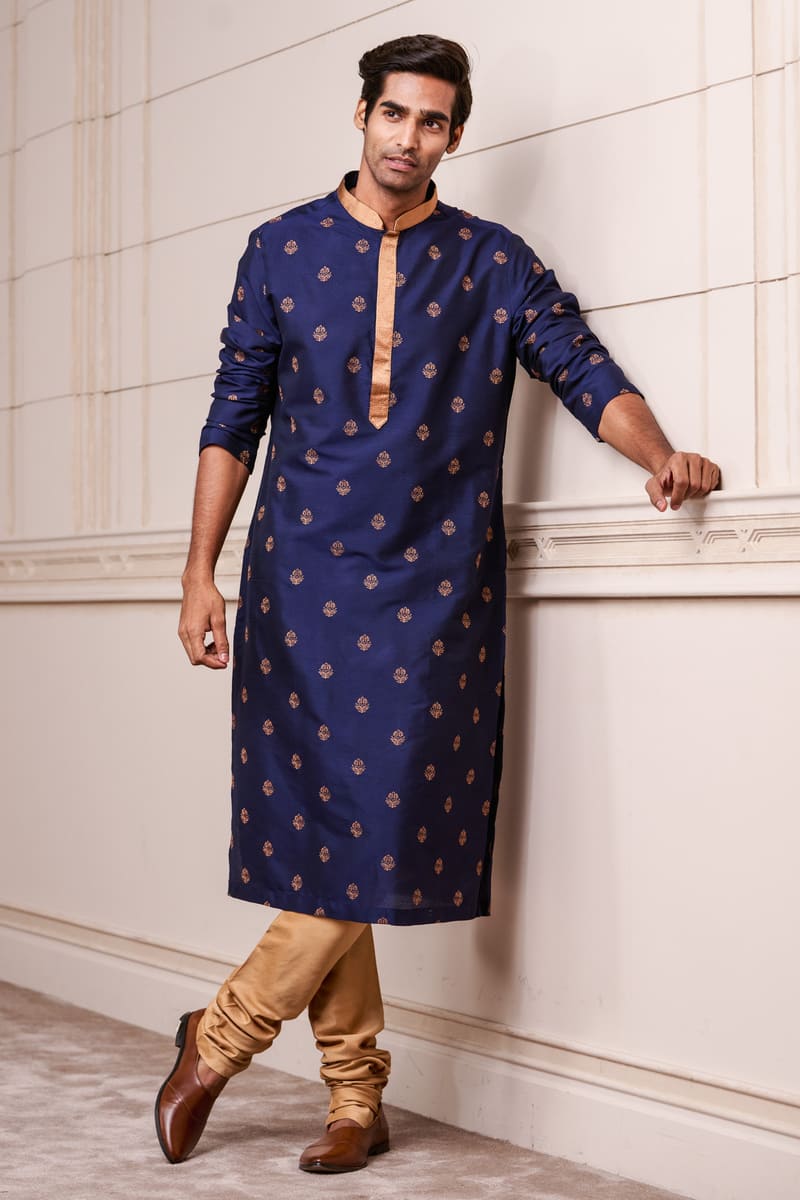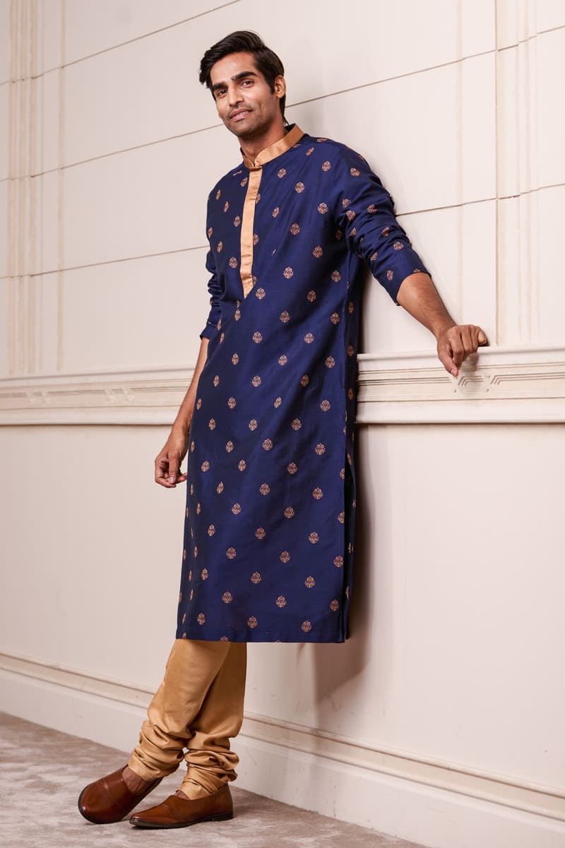 This Navy kurta set with a coordinated churidar, is a great choice for a day event. This style has delicate butti thread embroidery on the fabric and a contrasting gold band collar. Wear with brocade mojaris for a traditional look.