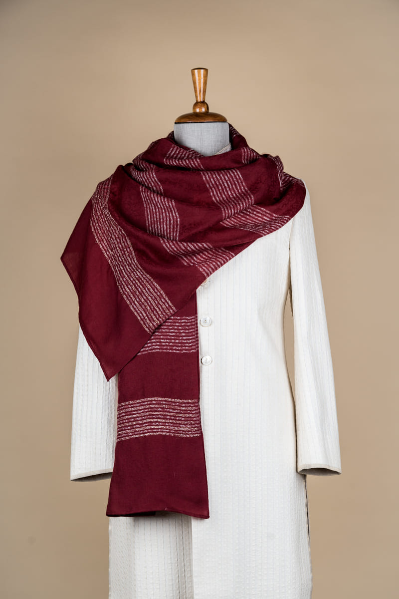 An eclectic colour will make your wedding ensemble pop, so do that with this red patterned stole with silver stripes.