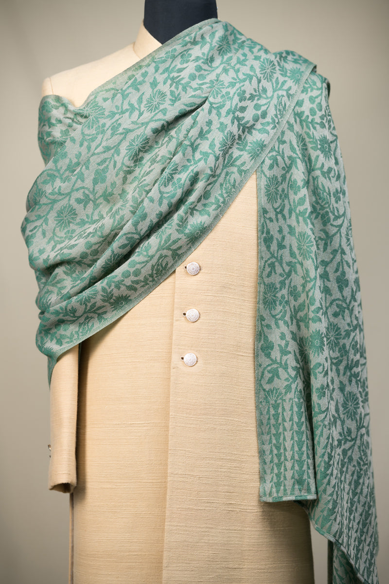 For smaller functions like the haldi or mehendi, keep the colours light and easy, even with your accessories just like this sage green stole featuring a vine and leaves pattern throughout.