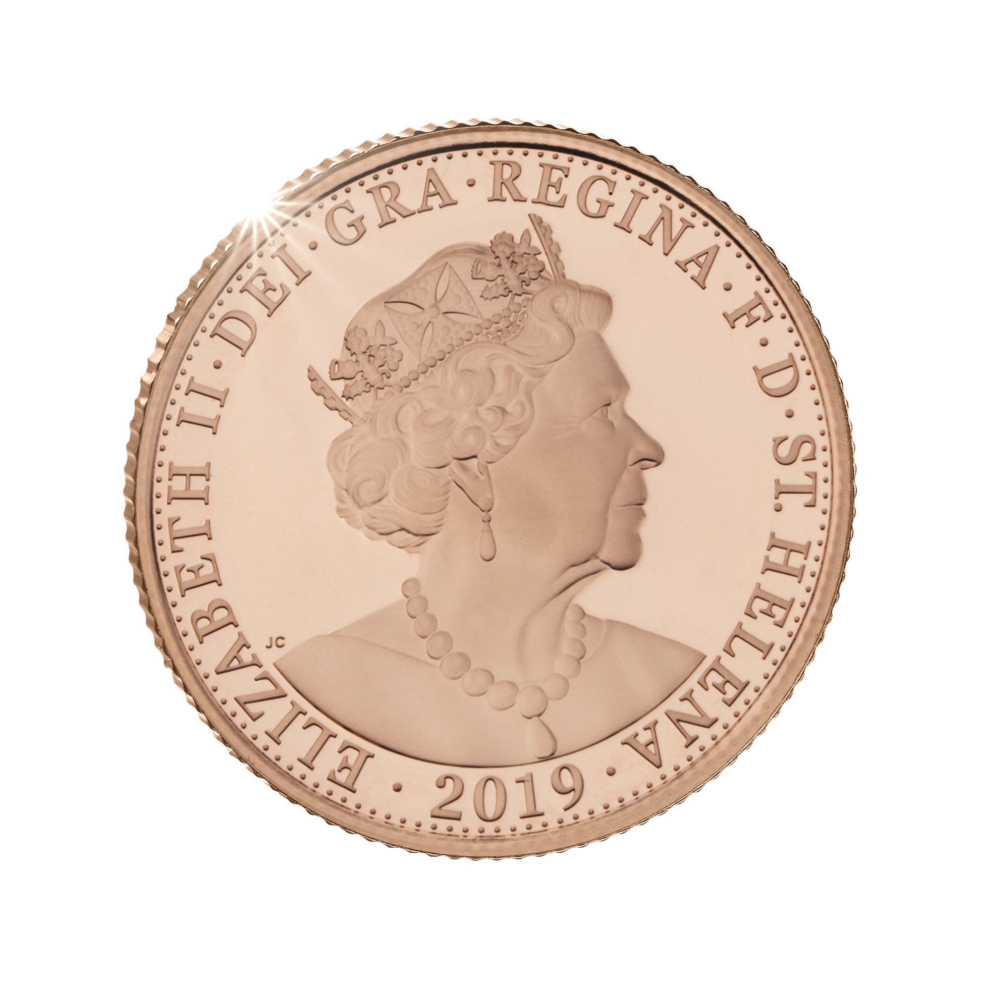 As a tribute to this unique coin, the 2019 Double Sovereign takes its inspiration from the majestic reverse design of the Gothic Crown featuring the four crowned shields representing the primary realms of Great Britain. Situated between the angles of the shields, roses, a shamrock and a thistle can be found. In the centre, the Order of the Garter bears the French inscription ‘HONI SOIT QUI MAL Y PENSE’ replicating Wyon’s original composition. Surrounding the design in a similar gothic style as its predecessor, the words ‘DIRIGE DEUS GRESSUS MEOS’ are repeated.