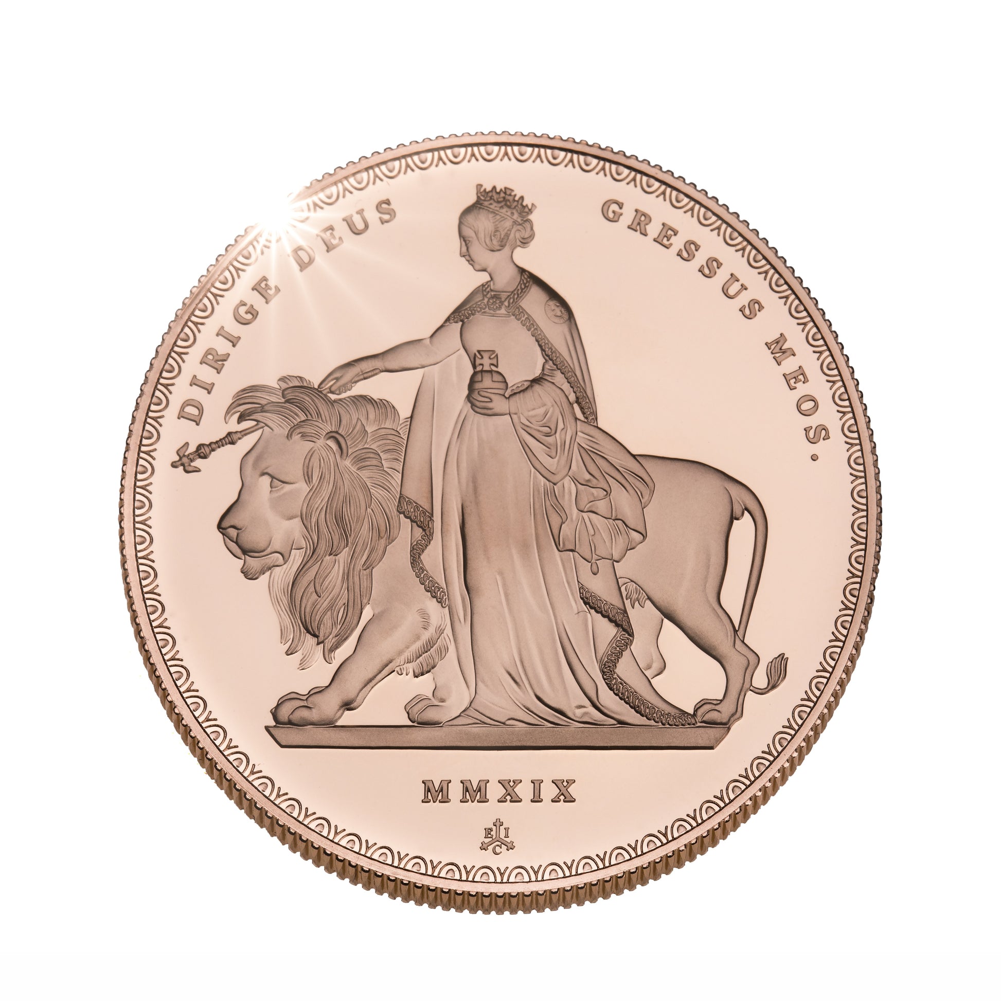 The 2019 Five Sovereign features the design from Queen Victoria’s rarest and most celebrated coins. Inspired by the 1839 Una and Lion 5 Pound Piece, arguably the most beautiful English coin in the world, this is a rare opportunity for serious collectors to acquire one of just 200 beautifully minted modern proof versions available individually.