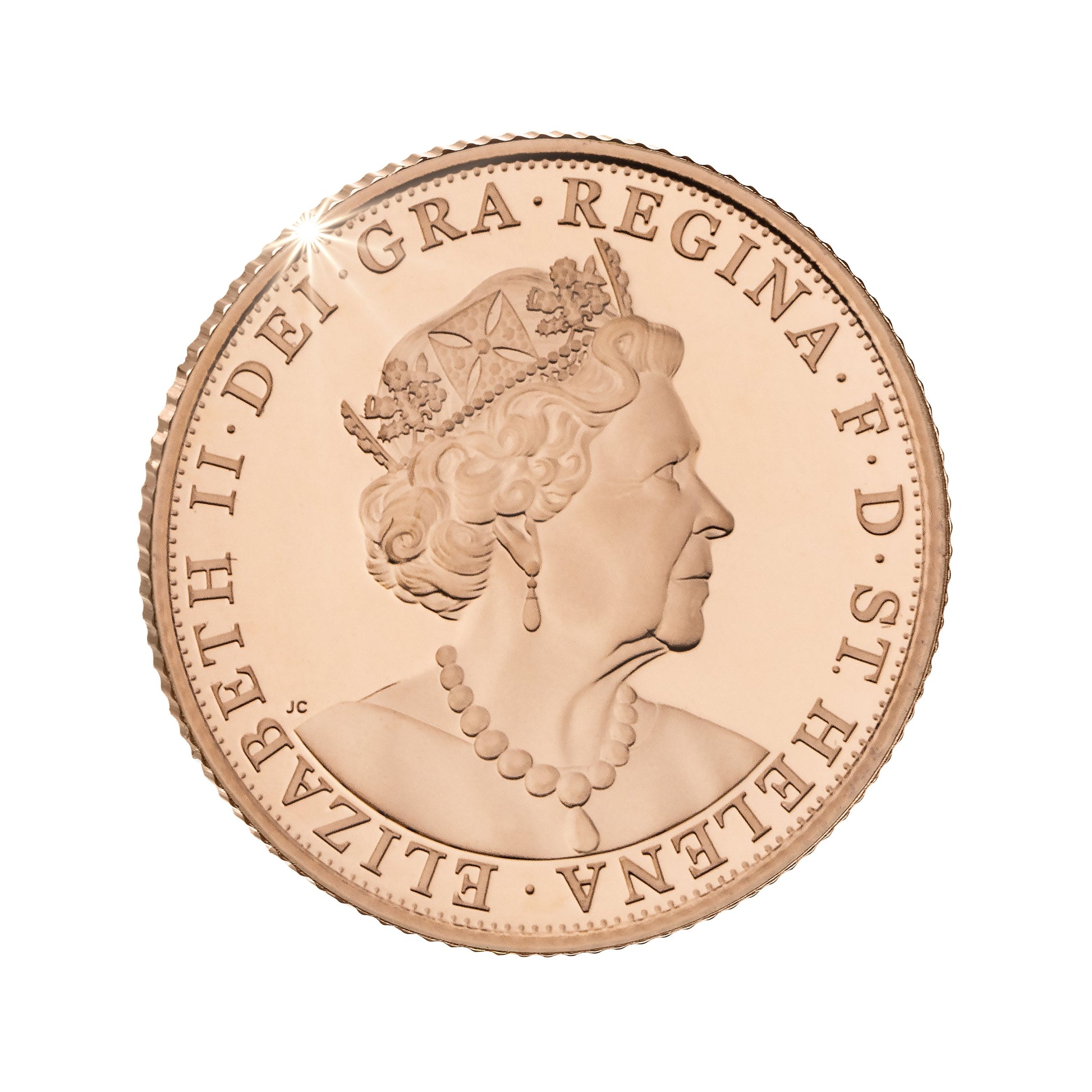 Depicting the beautiful the shield reverse as seen on Victoria’s last silver half-crown coins, this faithfully designed Sovereign incorporates the British spade-shaped coat of arms depicted on a single quarter-divided shield, featuring representations of the three realms of the United Kingdom.