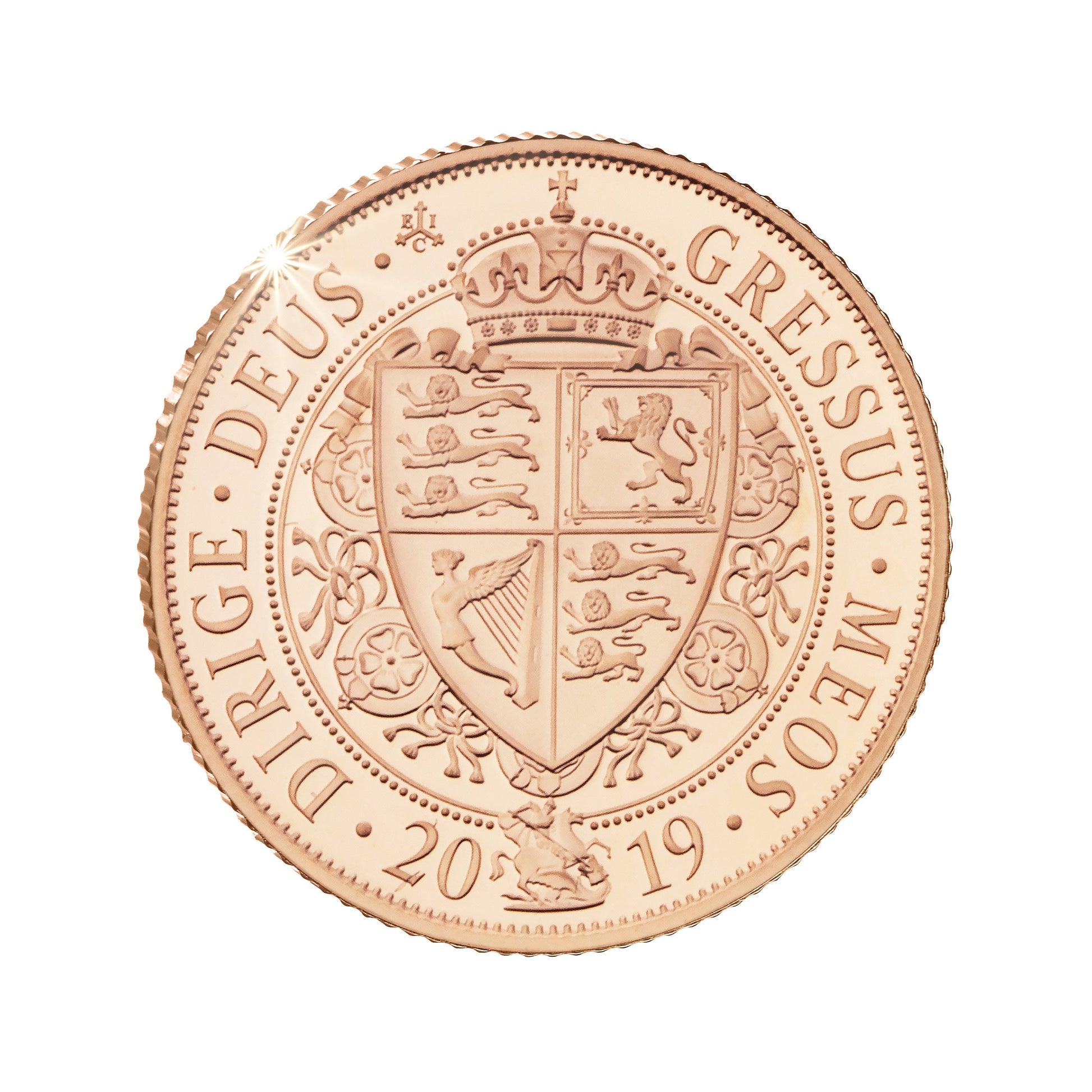 The spade-shaped shield is placed on a bed of Tudor roses and surrounded by the same inscription – DIRIGE DEUS GRESSUS MEOS - as found on all the 2019 Sovereign denominations in this collection. The 2019 date is separated by a small engraved George and the Dragon emblem echoing the style of the original 1897 Half Crown.