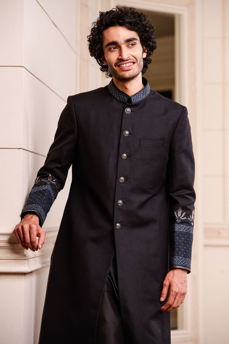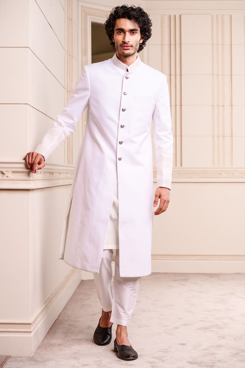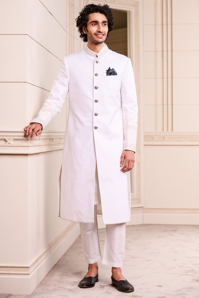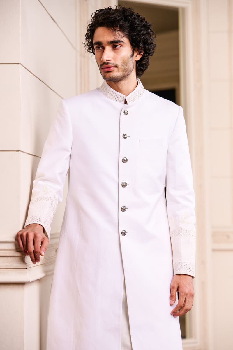 A sherwani in cotton linen, an elegant option for the sophisticated groom.The sherwani has swarovski crystals in a geometric pattern on the collar and on the sleeves.Pair it with a kurta, aligarhi pants and classic black loafers or mules.
