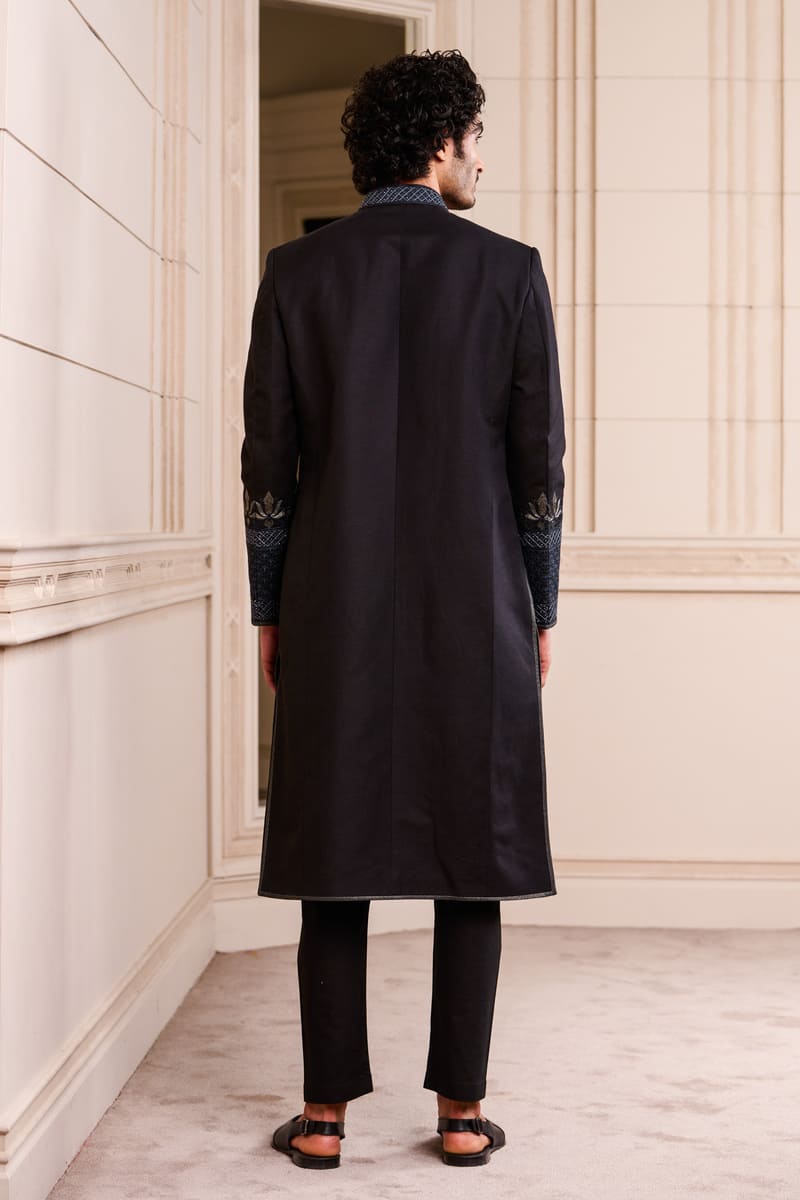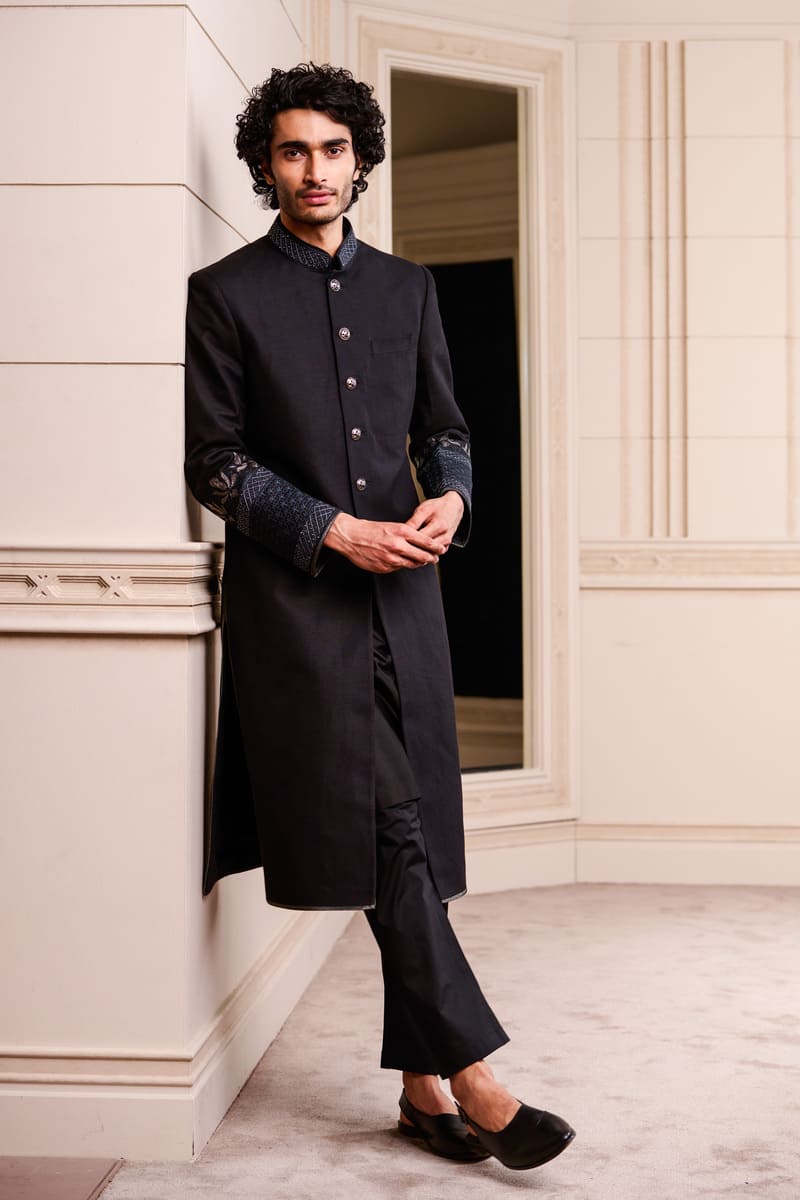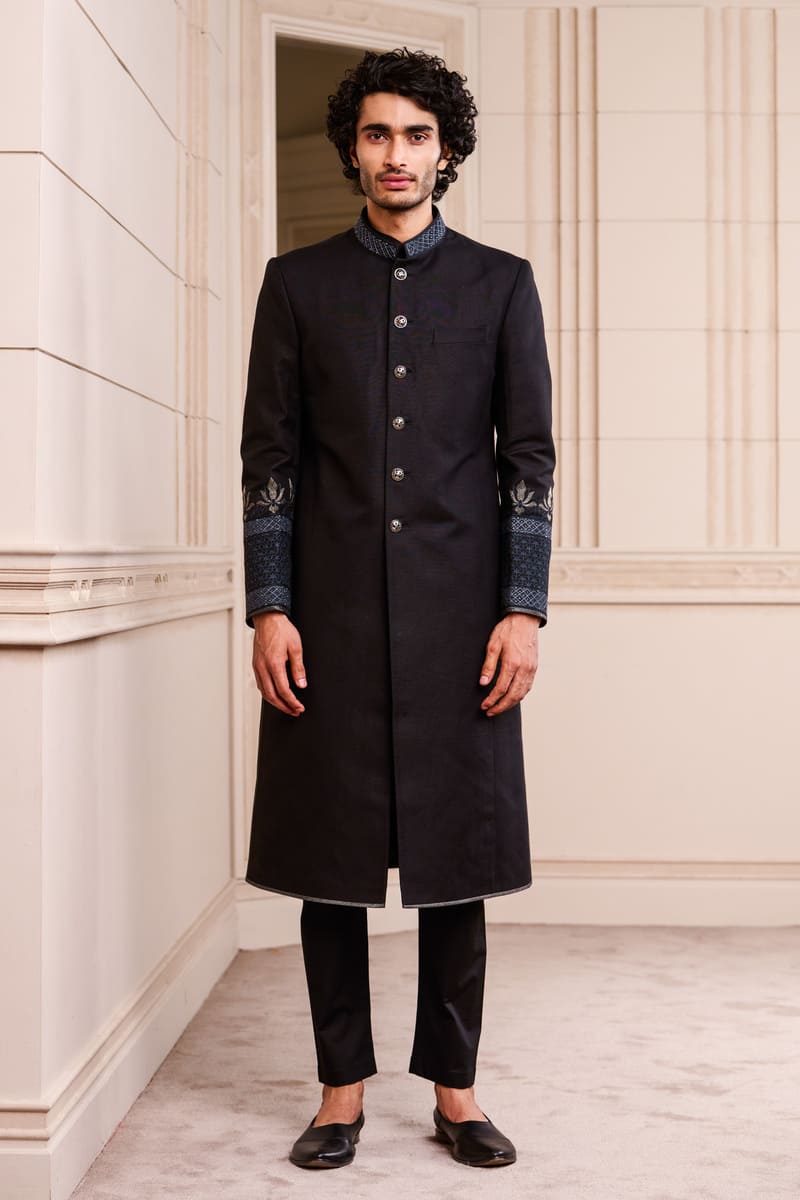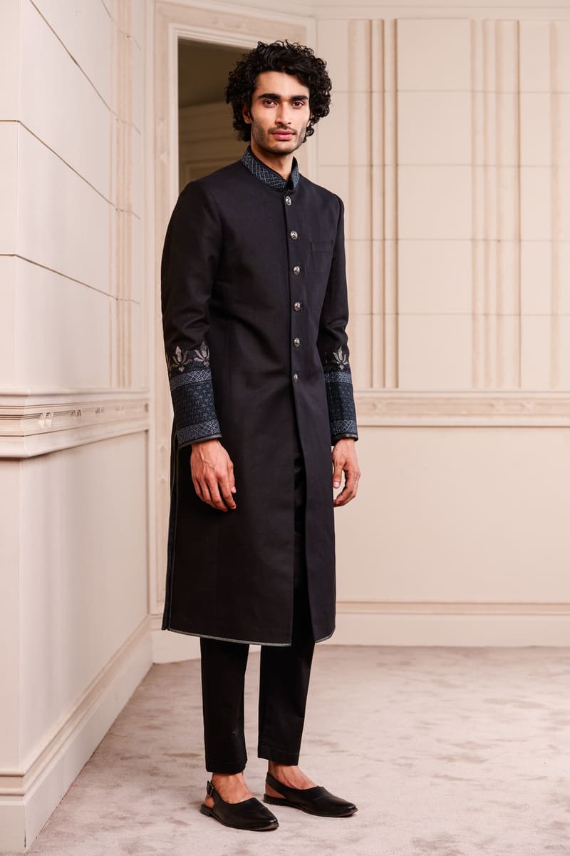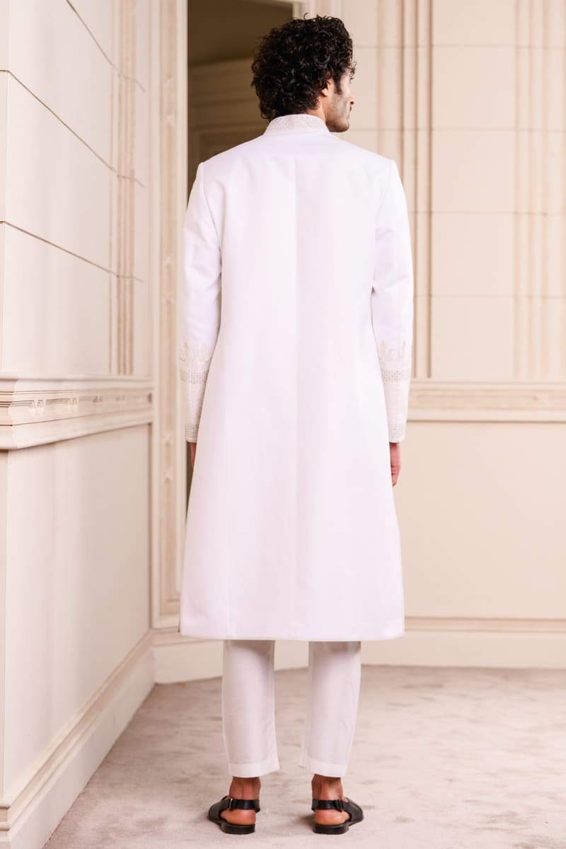 A sherwani in cotton linen, an elegant option for the sophisticated groom.The sherwani has swarovski crystals in a geometric pattern on the collar and on the sleeves.Pair it with a kurta, aligarhi pants and classic black loafers or mules.