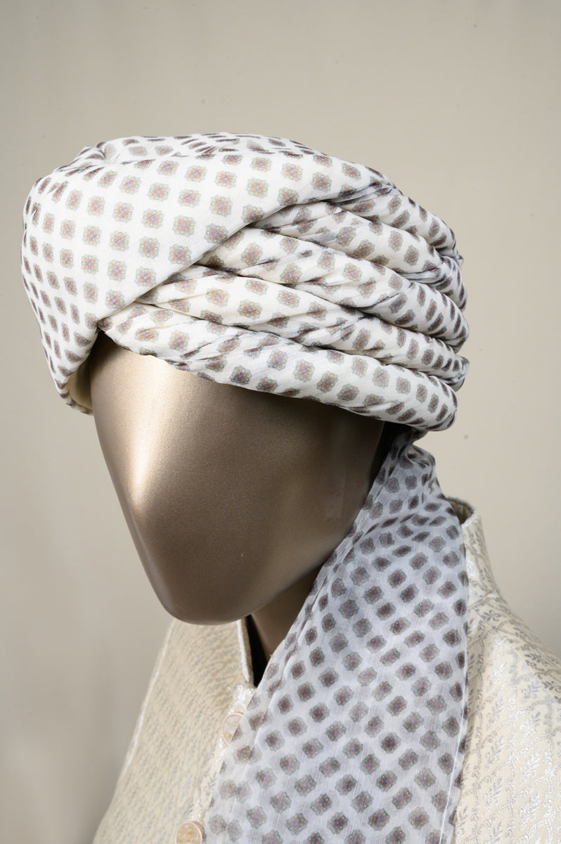 Accessorise your outfit of choice for a destination wedding with this smart white and maroon safa that is printed all over