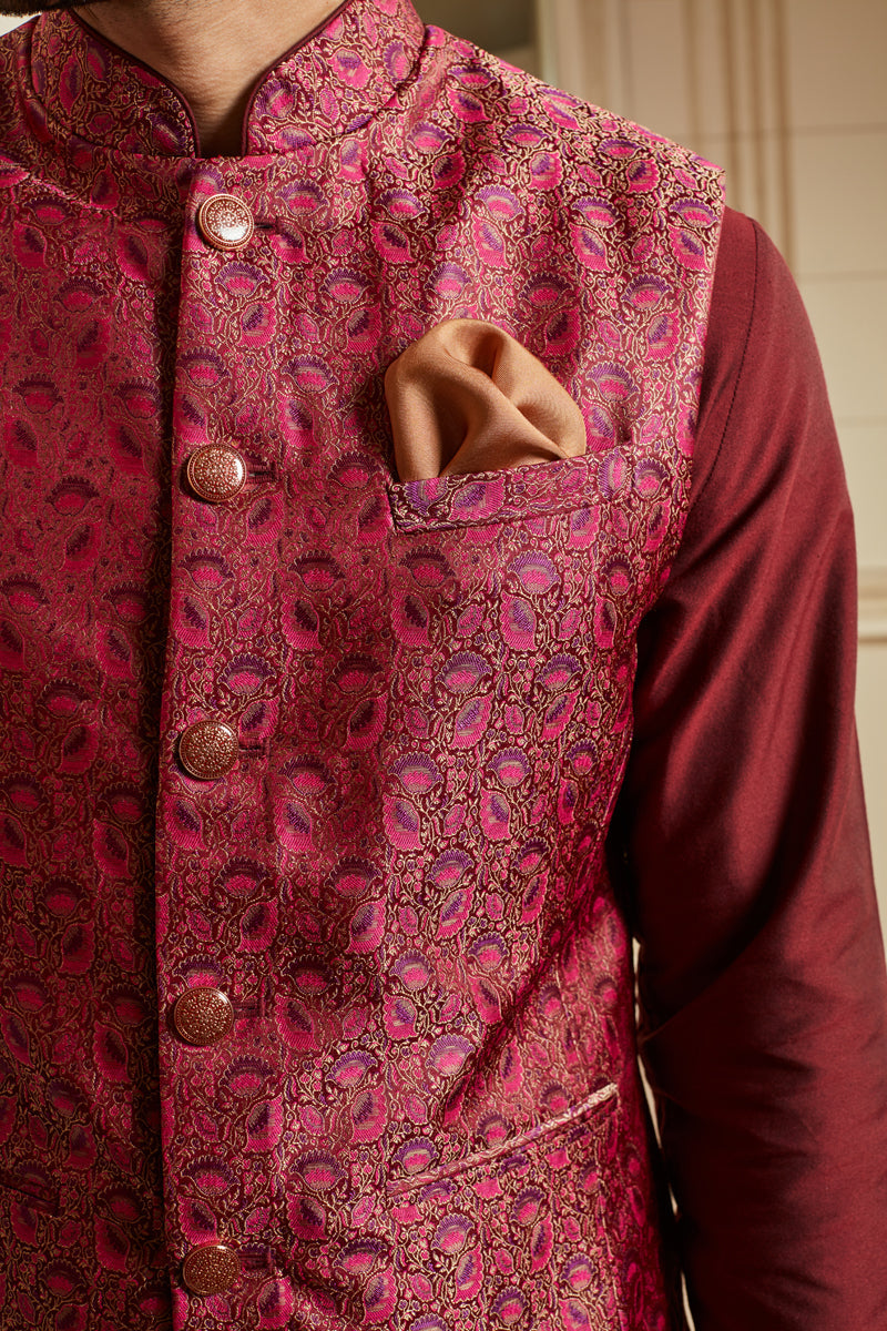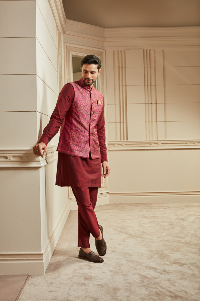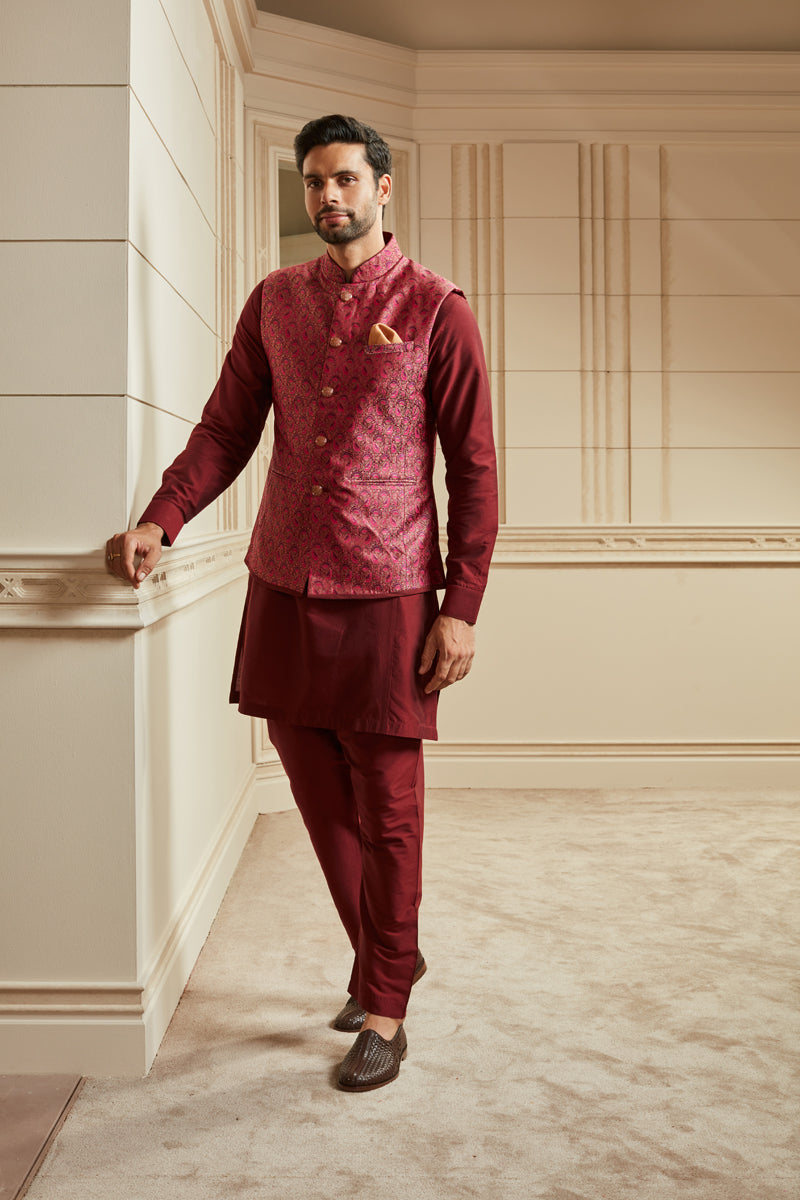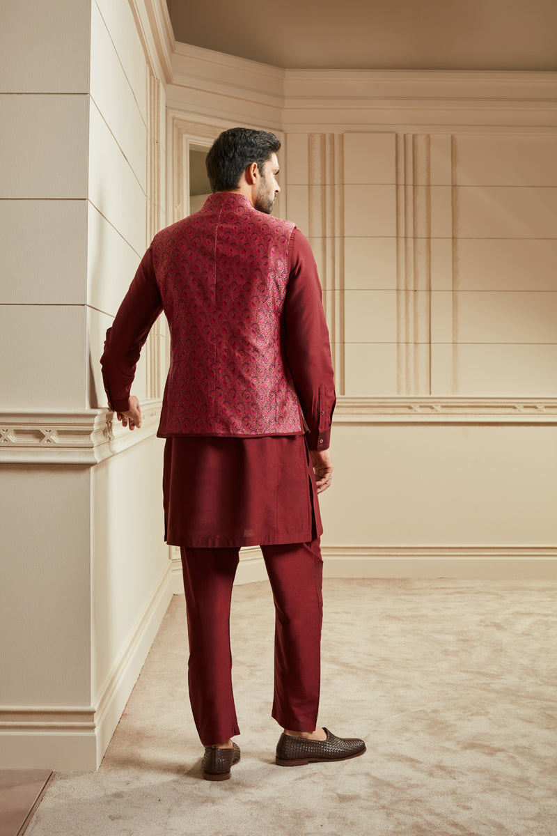 Wine Jacquard Kurta Bundi Set