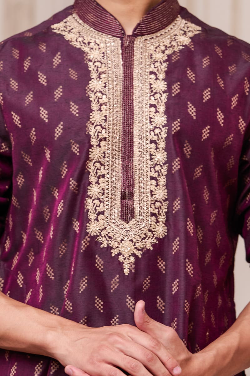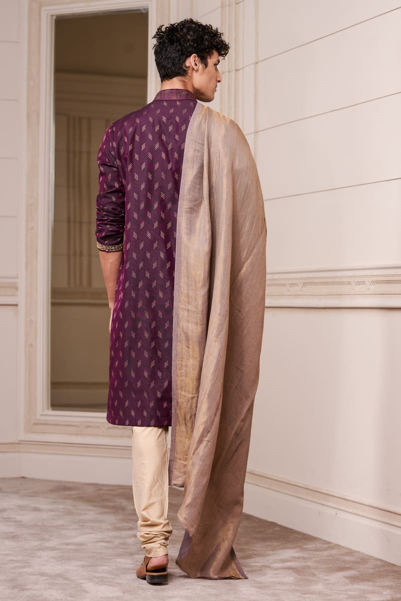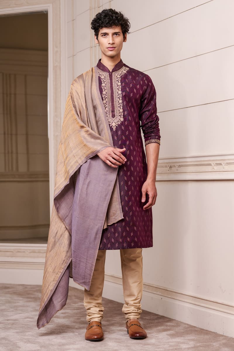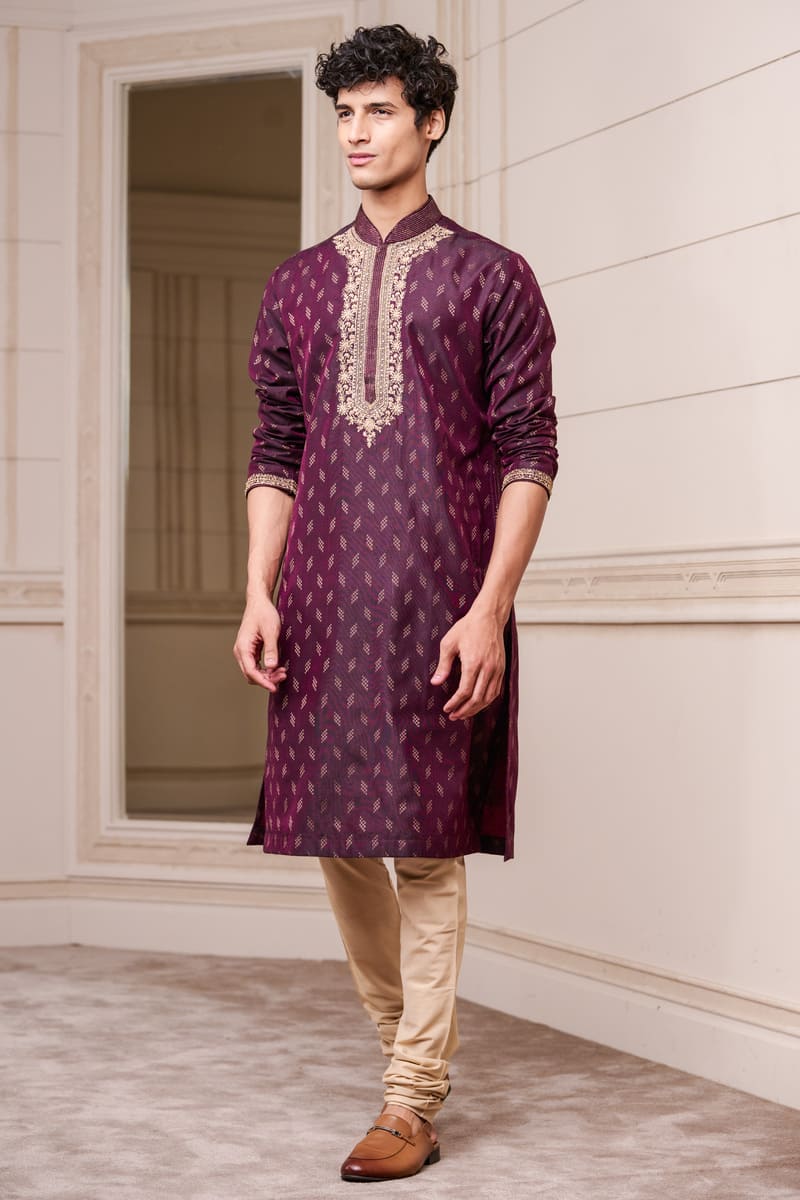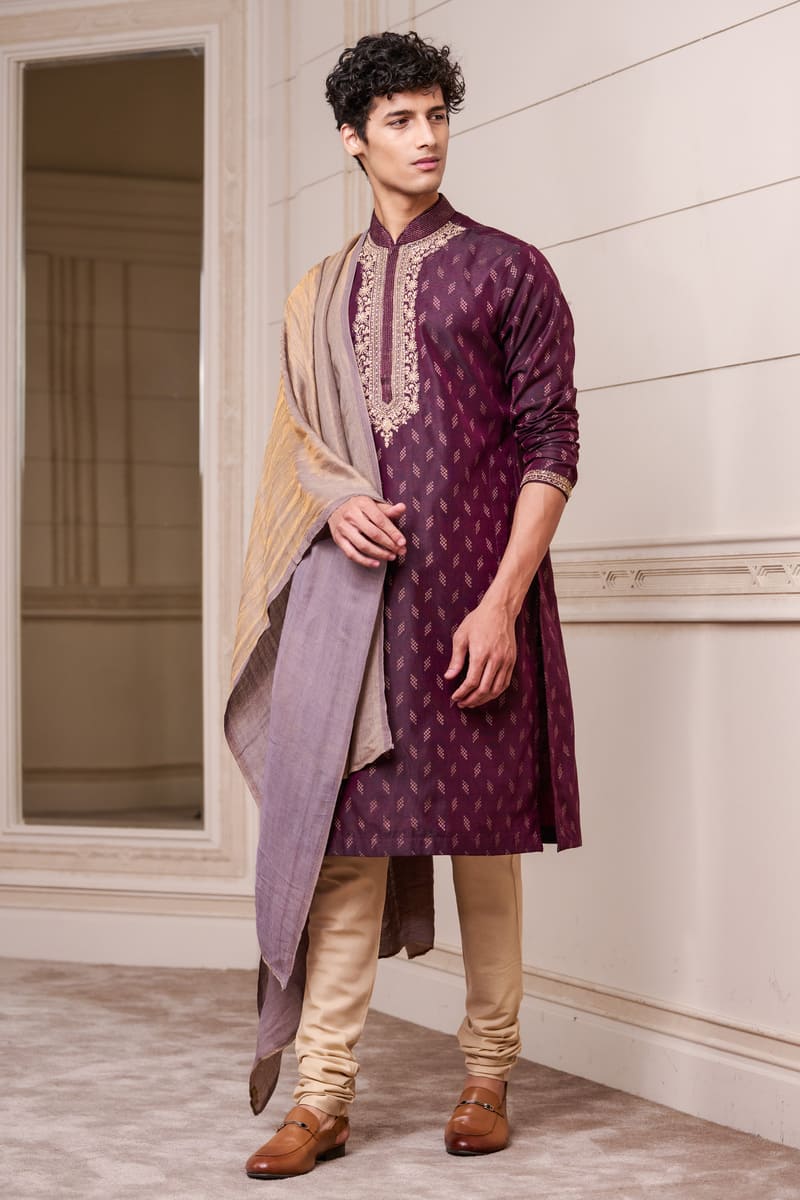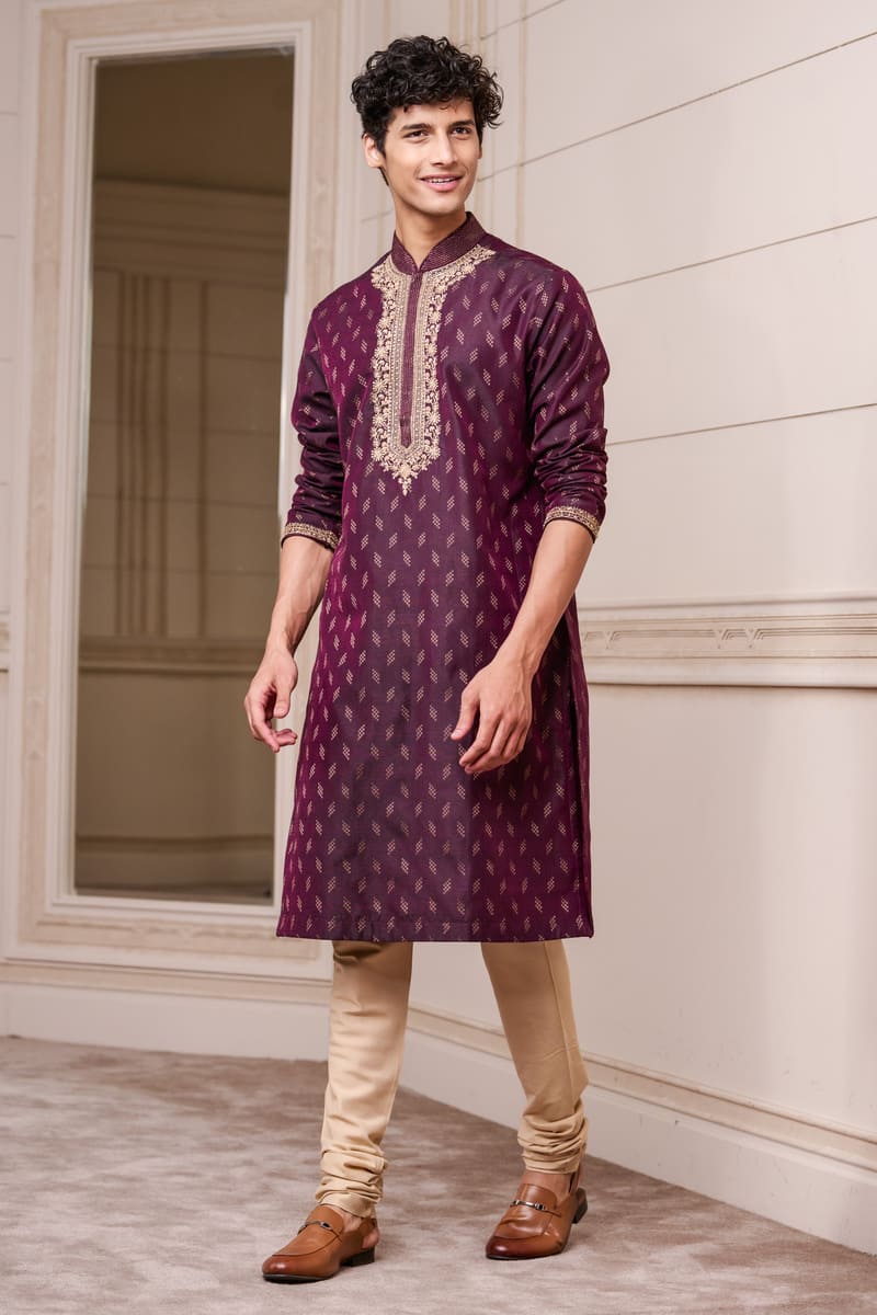 A kurta set in wine with a coordinated churidar in gold. The kurta is in a jacquard fabric, highlighted by beige dori embroidery and accents of zari embroidery. The classic combination of wine and gold is a great choice for an evening event.
