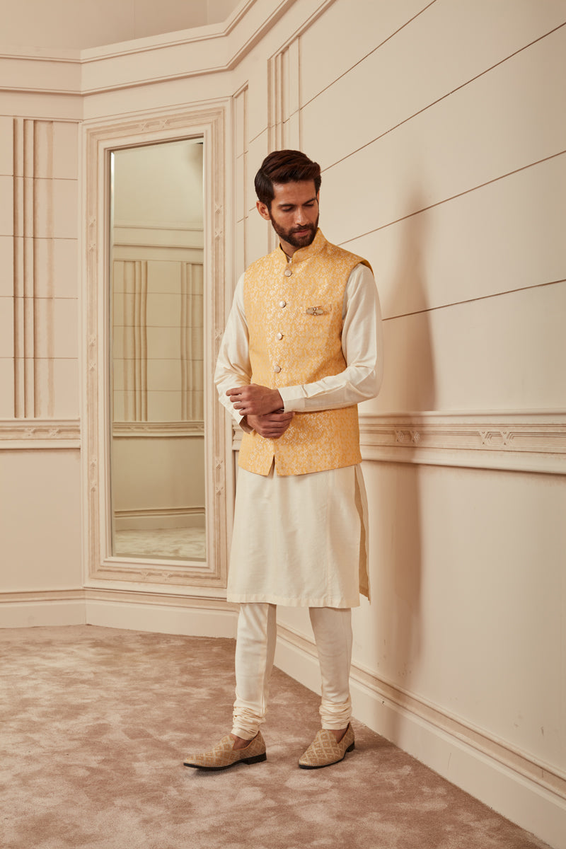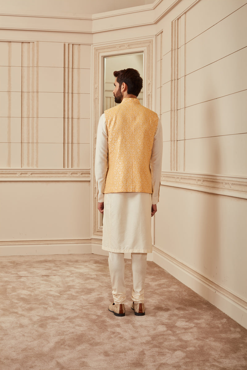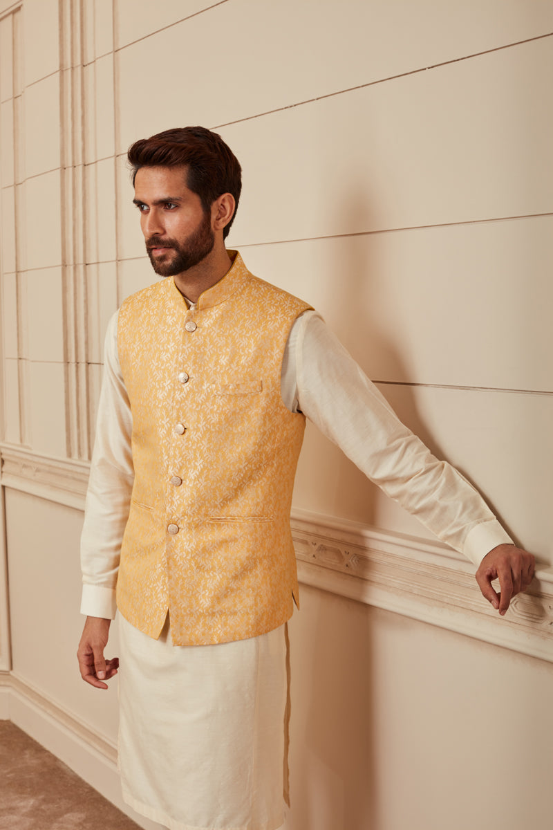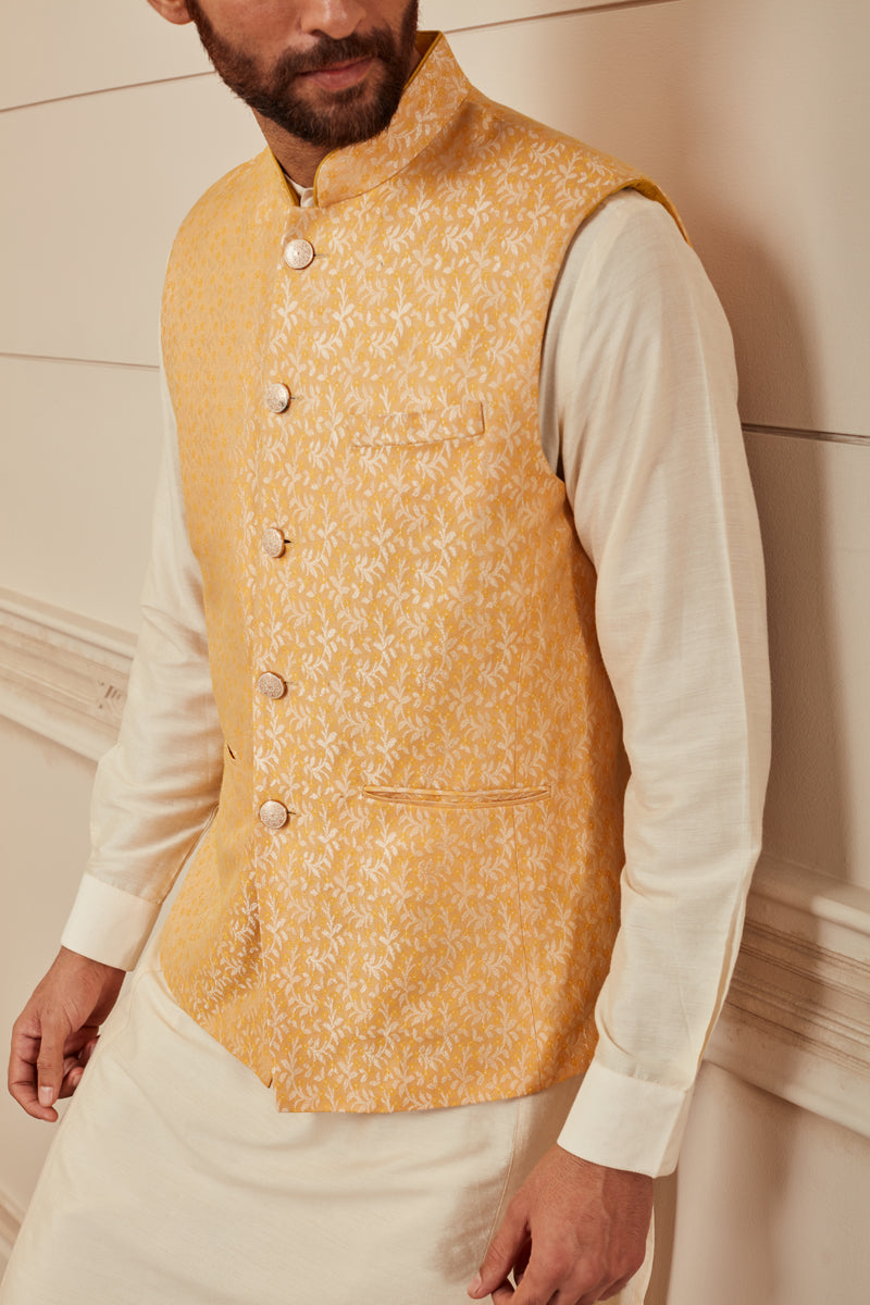 Wedding celebrations call for fun, joy, and colour. Take on that mood in our classic sunny yellow bundi. It is designed in brocade fabric and features silver floral motifs. Accentuated with gold metallic buttons, the jacket is best paired with an off-white kurta and churidar. Complete the look with patterned beige mojris and a matching pocket square.