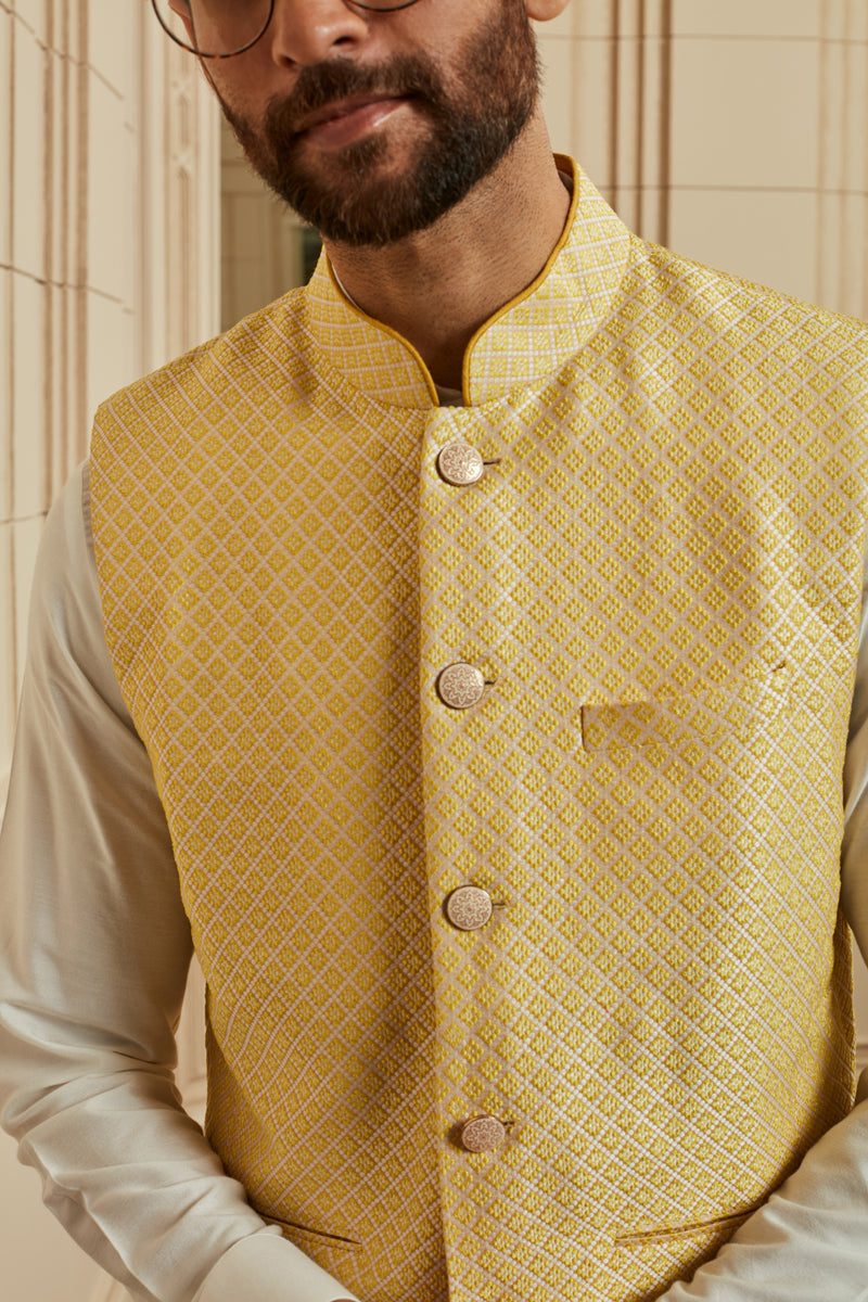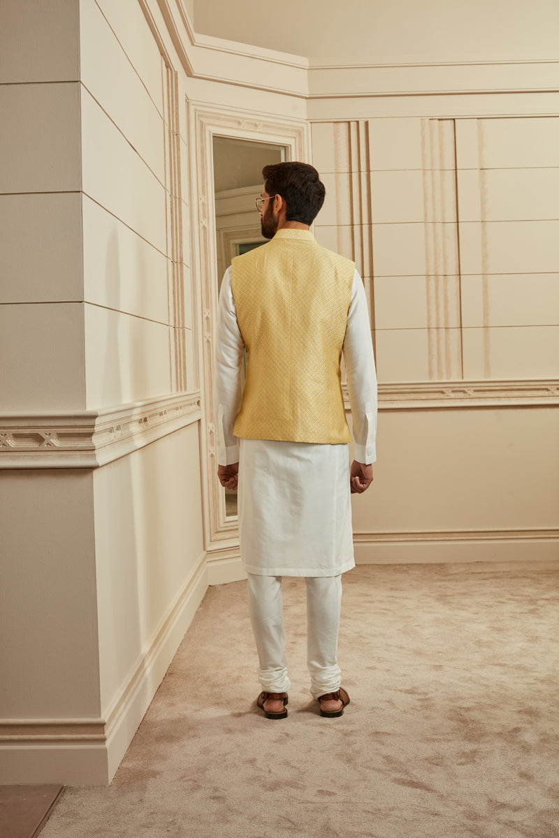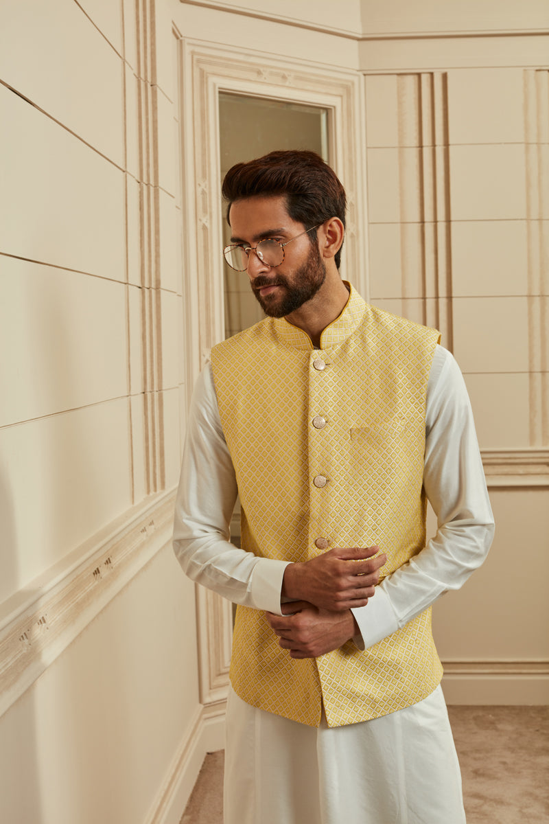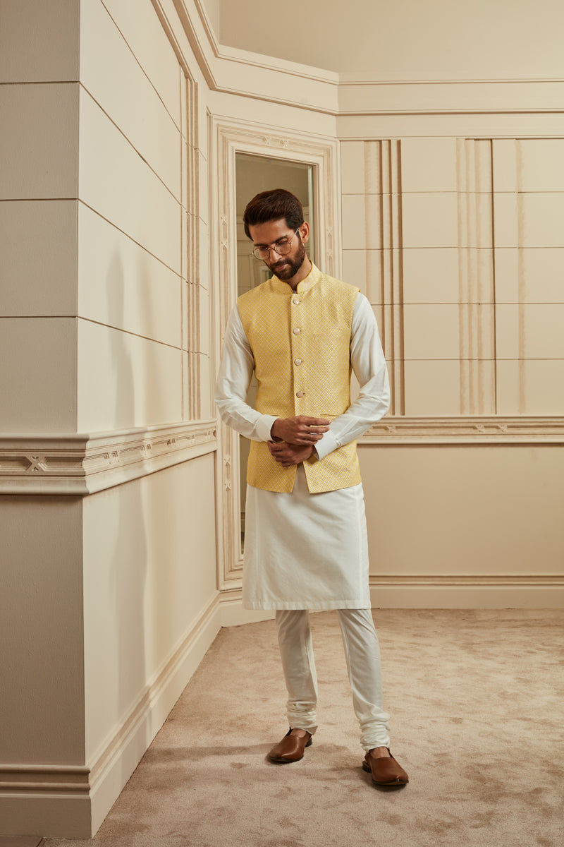 Take on an energetic avatar at your next wedding function in our yellow jacquard bundi. The jacket is paired with a white kurta and can be complemented with matching white churidar pants. Put on a pair of matching mint moccasins that will further elevate the look. We suggest carrying a contrasting forest green pocket square.